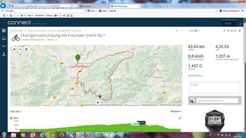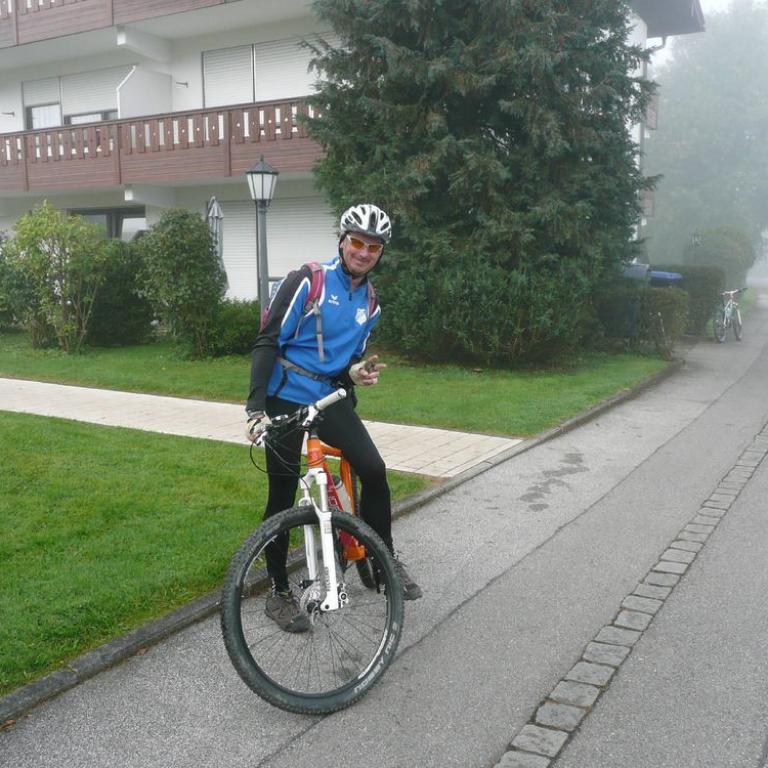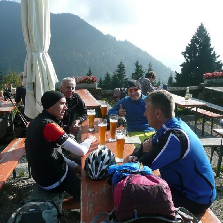 Die Tour starteten wir ab der Ferienwohnung meiner Eltern in Grassau. Brigitte, Emma und ich waren schon seit Donnerstag hier und unsere Freunde kamen um ca. 9 Uhr zu uns. Ich war leider nicht fit, da mich ein Virus bis vor 2 Tagen ans Bett gefesselt hatte. Trotzdem wollte ich die Tour nicht absagen, weil sich schon alle darauf gefreut hatten. Bei Frühnebel und eisigen 10 Grad fuhren wir den Radweg nach Bergen. Von hier fuhren wir auf der Straße zum Wanderparkplatz Kohlstadt. Von hier ging es dann einen Forstweg weiter, bis wir zu einer Abzweigung in Richtung Birkenmoos kamen. Teilweise ging es relativ steil und steinig nach oben bis wir eine herrliche Almenlandschaft erreichten. Von hier fuhren wir eine Forststraße leicht nach unten bis zur Abzweigung Jochbergalm. Den letzten Kilometer mussten wir über einen Wurzeltrail und zum Schluß noch eine steile Almwiese nach oben, bis wir die Alm auf 1276 m erreicht hatten. Hier kehrten wir natürlich ein und genossen Weißbier, Käsebrot und Sonne. Über einen kleinen Wanderpfad fuhren wir den Jochbergsattel in Richtung Marquartstein bis wir wieder auf eine Forststraße gelangten. Diese führte uns bis zu einer Abzweigung. Hier radelten wir wieder 100 Hm nach oben bis wir die Agergschwendt Alm auf 1040 m erreicht hatten. Hier warteten wir auf unsere Wandergruppe, die teilweise bis zum Hochgernhaus oder Hochgern gewandert waren. Auch hier genossen wir wieder Sonne und Weißbier. Rasant fuhren wir dann eine Forststr. nach unten bis wir Marquartstein erreichten. Von hier fuhren wir auf dem Radweg zurück nach Grassau.