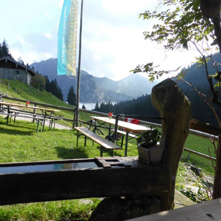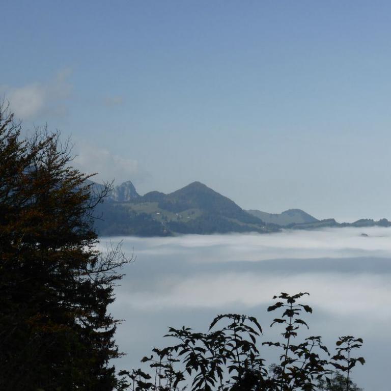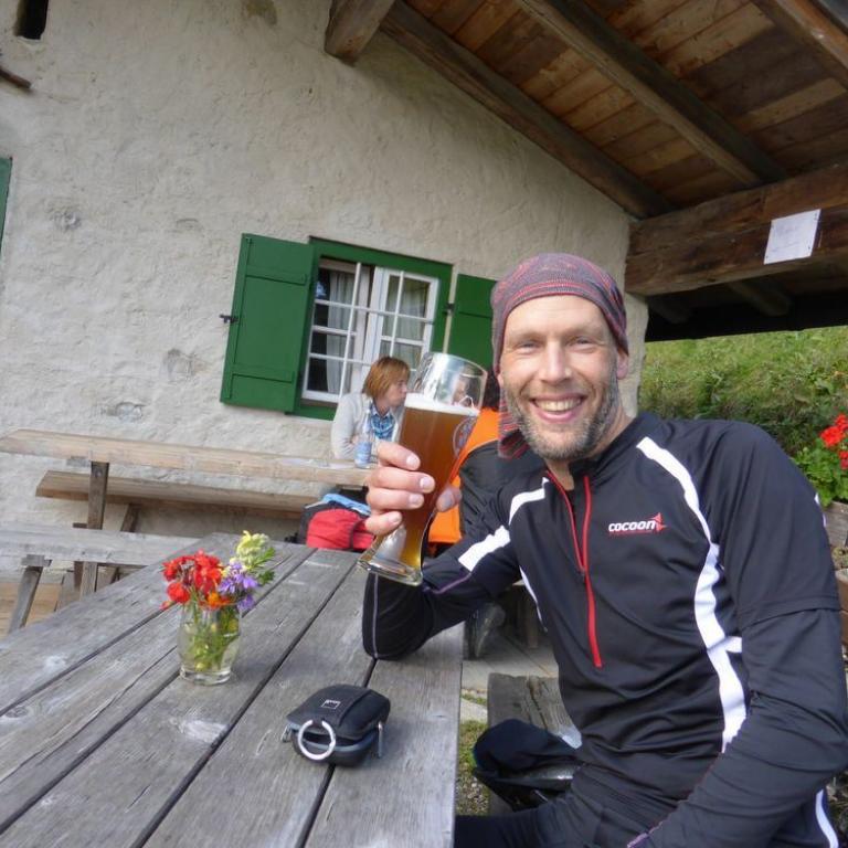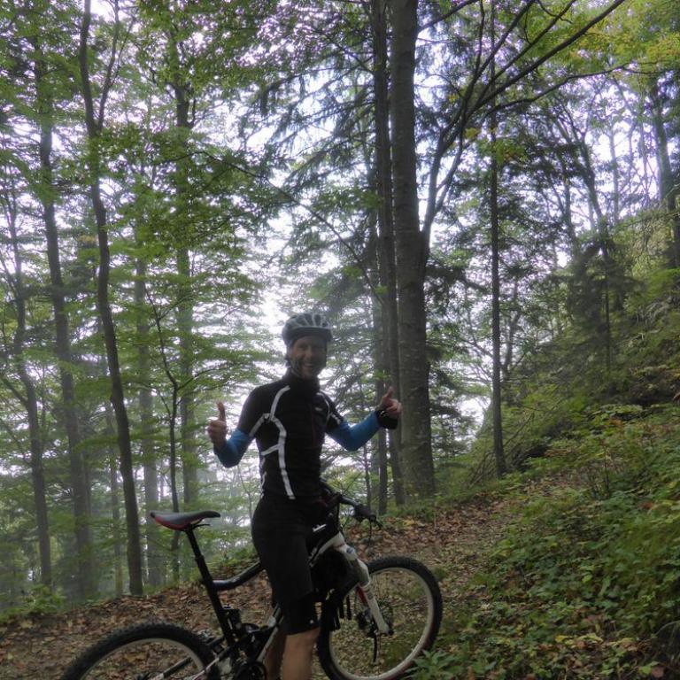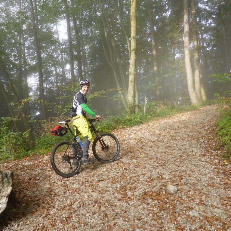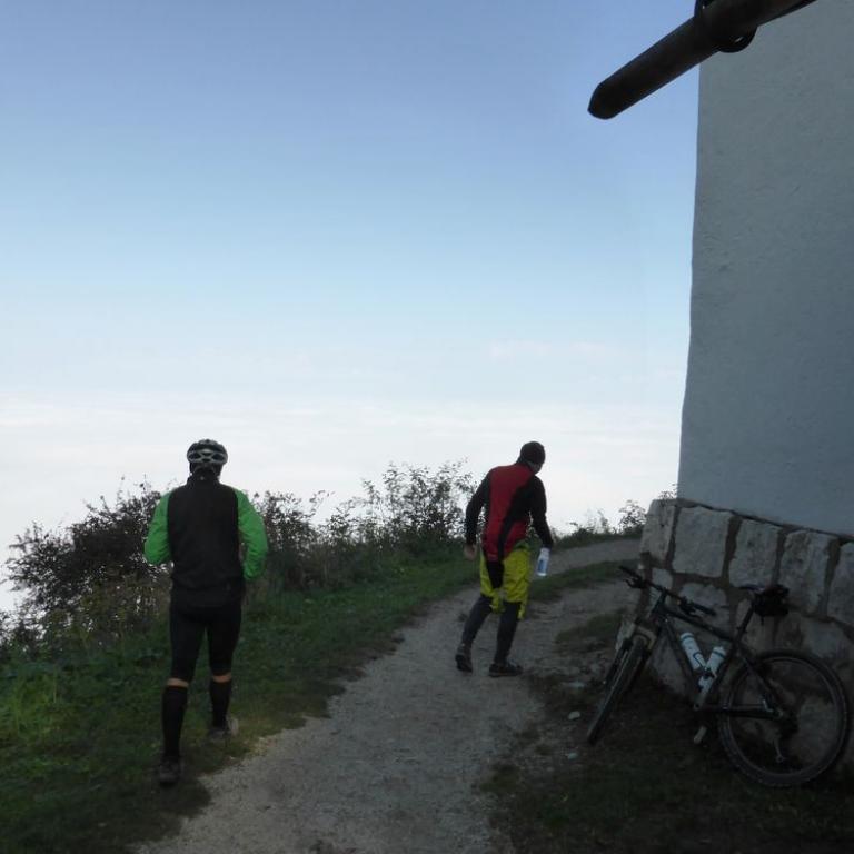 Wolfi und Hans kamen wieder um 9 Uhr zur Ferienwohnung meiner Eltern in Grassau. Von hier fuhren wir an der Tiroler Ache entlang in Richtung Marquartstein. Hier mussten wir schon mal steil zum Wanderparkplatz hinauf, wo wir uns gleich einmal den langen Sachen entledigten und im Rucksack verstauten. Genau so steil führte uns auch ein steiniger Wanderweg weiter. Nach ca. 1 Stunde und 600 Höhenmetern erreichten wir die Schnappenkirche auf 1100 Metern bei Sonne und blauem Himmel. Unter uns sahen wir nur Nebel. Einfach herrlich. Ein mit dem MTB nicht zu befahrender Trail ging weiter nach oben. Nach ca. 10 Minuten schieben konnten wir auch wieder auf unsere Bikes steigen und fuhren über einen pfiffigen Singletrail zur Staudacher Alm. Ein Almentrail führte uns weiter, teilweise über Wurzeln, Moorgebiet und vielen Steinen bis zur Vorderalm. Hier kehrten wir ein bei Sonnenschein und einem gutem Speckbrot. Von hier fuhren wir zuerst auf einer Forststraße und dann einem steilen Wanderweg, der eigentlich wegen Hochwasserschäden gesperrt war nach unten bis Staudach. Die Schäden waren aber schon wieder repariert und die Brücken erneuert so das wir auch ankamen. Von Staudach waren es nur noch 2 Kilometer zurück nach Grassau.