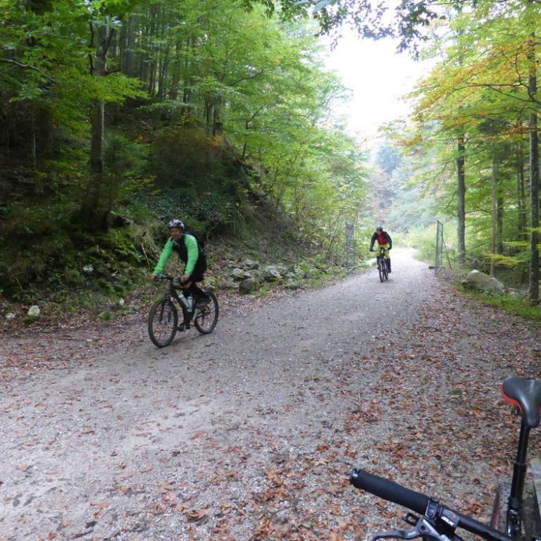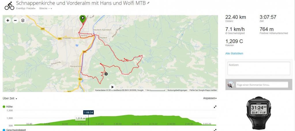 Wolfi und Hans kamen wieder um 9 Uhr zur Ferienwohnung meiner Eltern in Grassau. Von hier fuhren wir an der Tiroler Ache entlang in Richtung Marquartstein. Hier mussten wir schon mal steil zum Wanderparkplatz hinauf, wo wir uns gleich einmal den langen Sachen entledigten und im Rucksack verstauten. Genau so steil führte uns auch ein steiniger Wanderweg weiter. Nach ca. 1 Stunde und 600 Höhenmetern erreichten wir die Schnappenkirche auf 1100 Metern bei Sonne und blauem Himmel. Unter uns sahen wir nur Nebel. Einfach herrlich. Ein mit dem MTB nicht zu befahrender Trail ging weiter nach oben. Nach ca. 10 Minuten schieben konnten wir auch wieder auf unsere Bikes steigen und fuhren über einen pfiffigen Singletrail zur Staudacher Alm. Ein Almentrail führte uns weiter, teilweise über Wurzeln, Moorgebiet und vielen Steinen bis zur Vorderalm. Hier kehrten wir ein bei Sonnenschein und einem gutem Speckbrot. Von hier fuhren wir zuerst auf einer Forststraße und dann einem steilen Wanderweg, der eigentlich wegen Hochwasserschäden gesperrt war nach unten bis Staudach. Die Schäden waren aber schon wieder repariert und die Brücken erneuert so das wir auch ankamen. Von Staudach waren es nur noch 2 Kilometer zurück nach Grassau.
