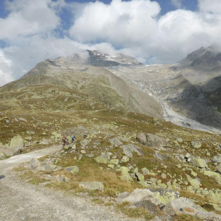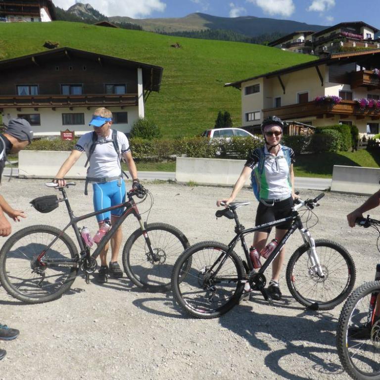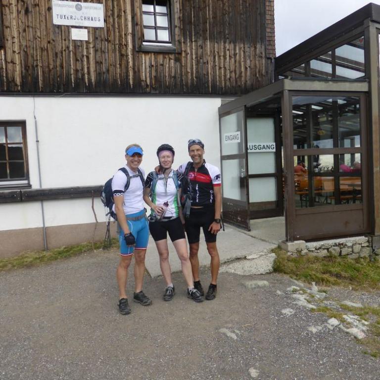Am Freitag trafen wir uns zuerst bei Wolfi und dann bei Hans in Leiblfing. Wir verstauten unsere 5 MTB`s in 2 Autos und auch wir selbst fanden noch Platz. Brigitte und ich versuchten unser Glück auf der B15 über Rosenheim und die anderen Drei über München. Die München Fraktion war fast eine halbe Stunde vor uns am Startpunkt im Zillertal in Vorderlanersbach auf 1250m. Wir hatten sonniges, fast wolkenloses, perfektes Bergwetter. Mittag saßen wir dann auch schon auf unseren Rädern und fuhren auf der Straße bis nach Hintertux. Hier führte uns ein Forstweg die Höhenmeter nach oben. Schnell waren wir oberhalb der Baumgrenze und hatten einen herrlichen Blick auf den Hintertuxer Gletscher und Olperer. Unser erster kurzer Stopp war an der Bichlalm auf 1600 m. Nach einer Banane und Müsliriegel konnte es auch schon weitergehen. Immer steiler wurde der Weg und der Schweiß floss in Strömen. Ab der Seilbahnstation auf 2100 m wurde es nochmals steiler und steiniger. Teilweise musste geschoben werden. Wir kämpften uns hoch bis zum Tuxer-Jochhaus auf 2313 m, das wir nach knapp 2 Stunden erreichten. Hier genehmigten wir uns eine Radler, Kaiserschmarrn und Würstlsuppe. Nach der verdienten Pause mit Gletscherblick fuhren wir noch ein paar Höhenmeter nach oben zum Tuxer Joch auf 2338 m.