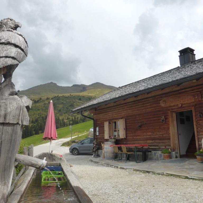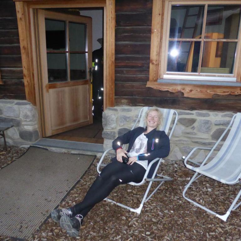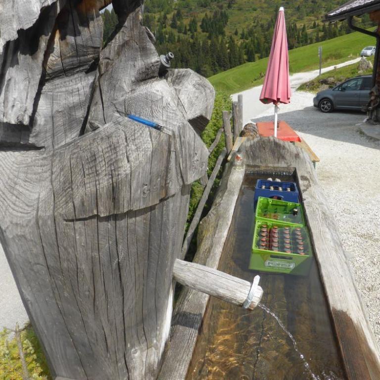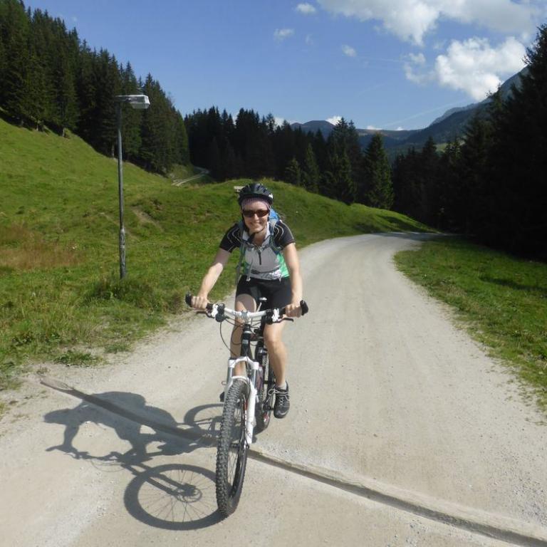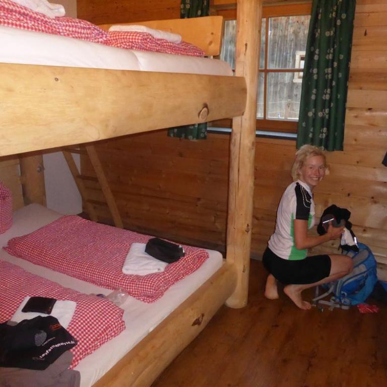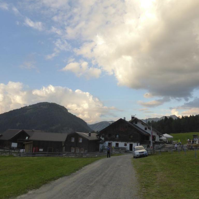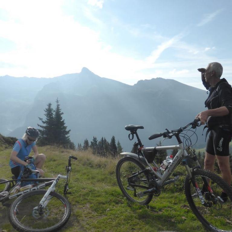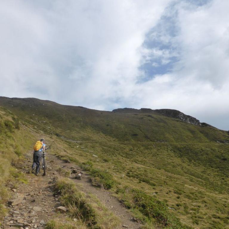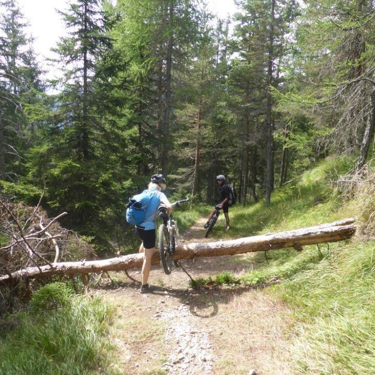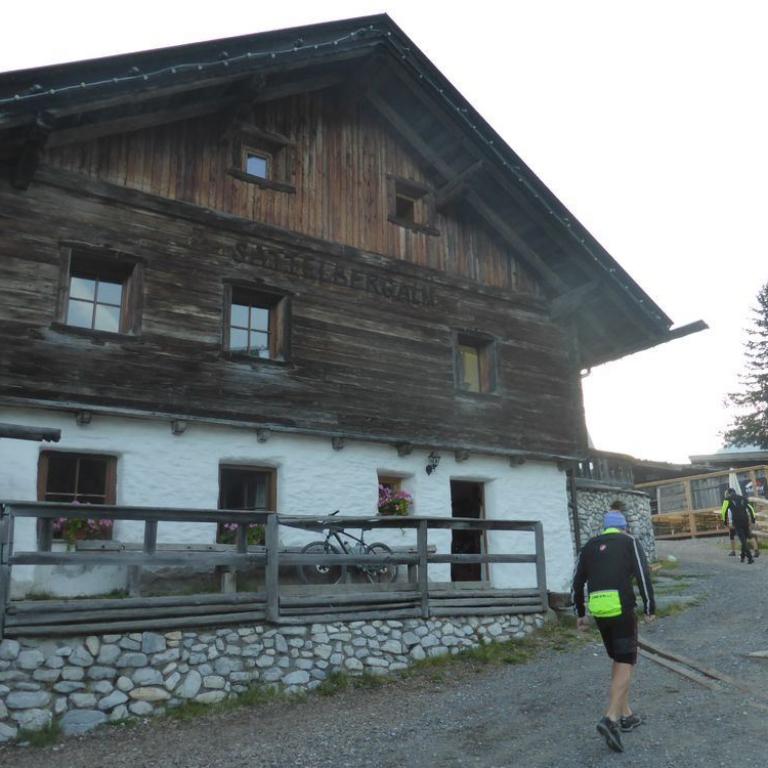 Bis hierher war ja mal abgesehen von den schon krassen Steigungen noch alles befahrbar. Aber der Trail ab dem Tuxer Joch nach unten war alles andere als befahrbar. Hans und Wolfi versuchten es ein paar Mal, aber landeten ziemlich schnell und unsanft in den Steinen. Uns blieb nichts anderes übrig als die 600 Hm das Bike zu schieben und teilweise zu tragen. Erst nach 1 Schiebestunde konnten wir wieder aufsteigen und fuhren weiter auf Forstwegen und Straßen durch ein herrliches Tal mit saftig grünen Grashängen nach unten. Wir kamen durch die Ortschaften Kasern, Schmirn und St. Jodok. Hier gelangten wir auf die alte Brennerstraße, auf der wir ein paar Kilometer bleiben mussten. In Gries bogen wir dann ab und fuhren unter der Brennerautobahn hindurch bis wir nach Vinaders auf 1289 m kamen. Nun hatten wir den letzten großen Anstieg für heute vor uns. 400 Hm auf 7 km zur Sattelalm. Ich radelte immer mit Brigitte mit, während die anderen Drei schon mal voraus fuhren. Wir kämpften uns auf einer Forststraße durch den Wald Höhenmeter für Höhenmeter nach oben. Nach einer guten Stunde erreichten wir um kurz vor 19 Uhr die Sattelbergalm auf 1633 m. Wir bezogen unser Zimmer, was sich als First Class Ferienwohnung herausstellte. Für 35 Euro pro Person incl. Frühstück bekamen wir einen Übernachtungsplatz vom Feinsten. Nach einer dringend nötigen Dusche gingen wir zum Essen und ließen den Tag bei einem Bierchen ausklingen. Insgesamt waren wir 43 km mit 1800 Hm in knapp 6 Stunden unterwegs.