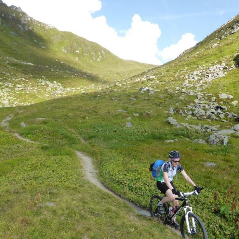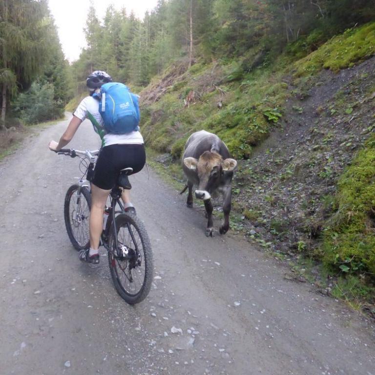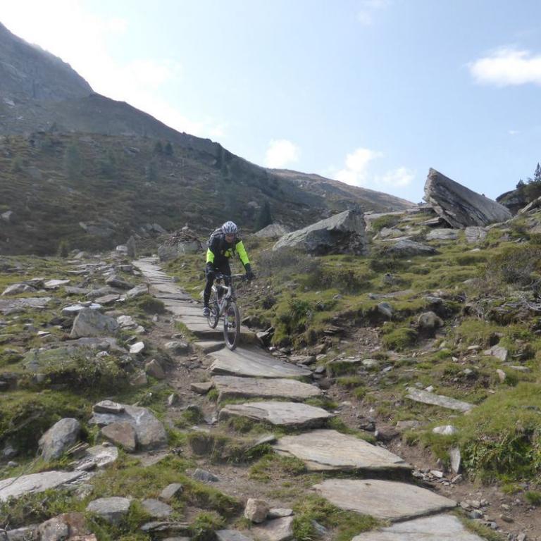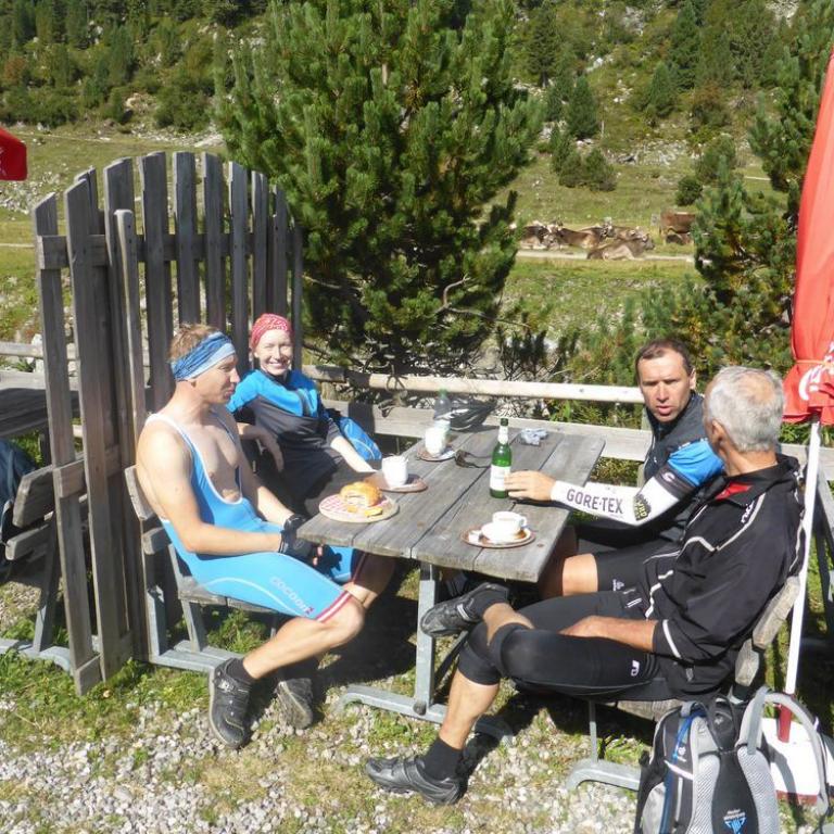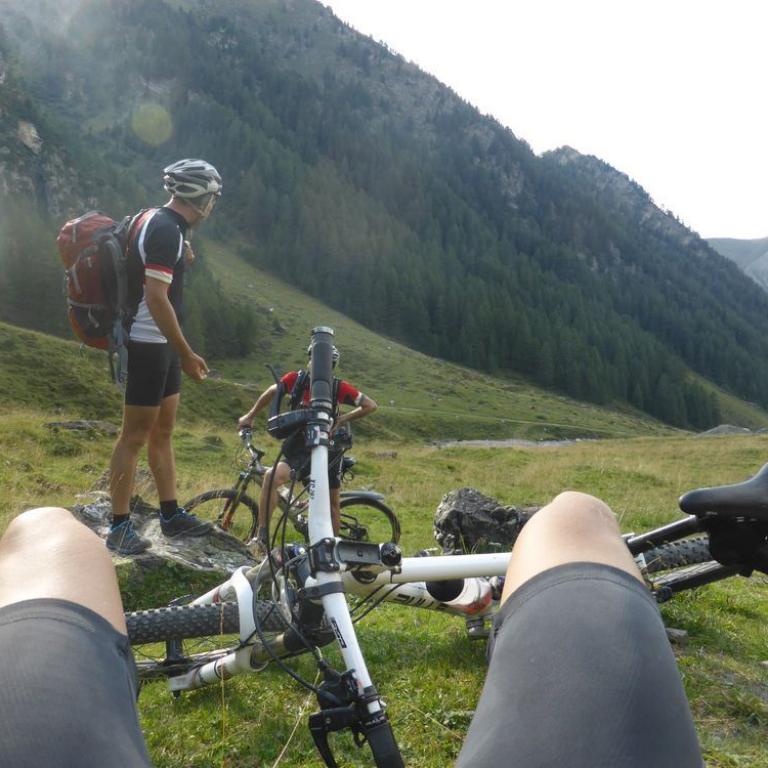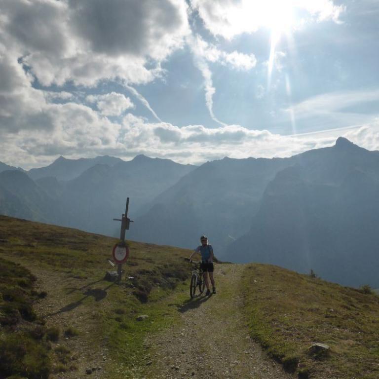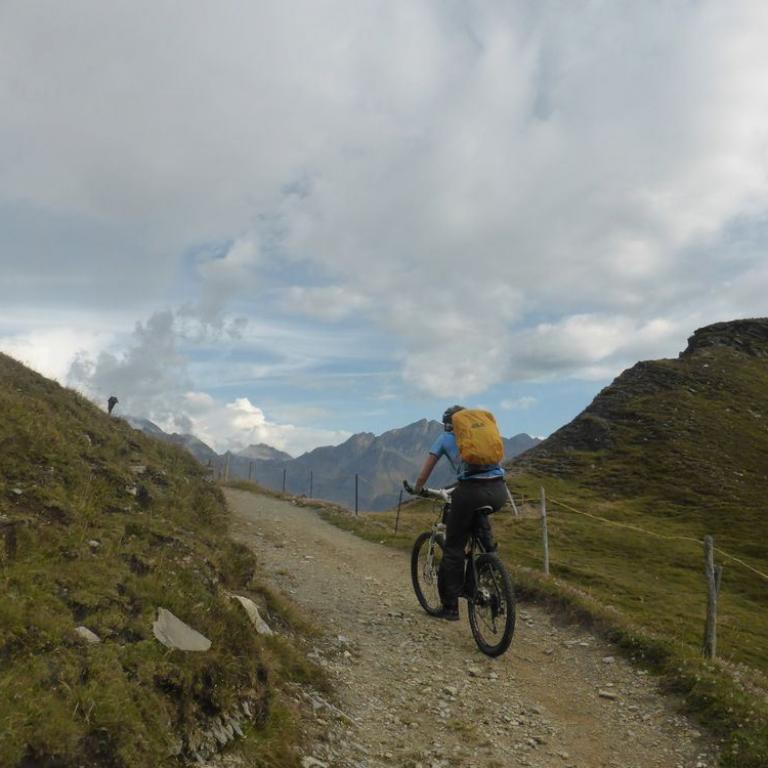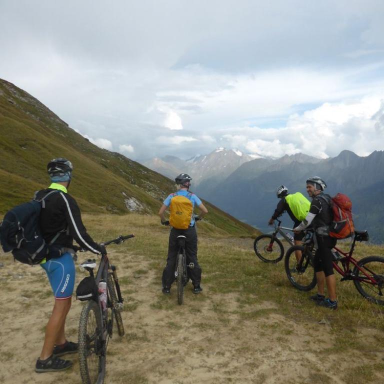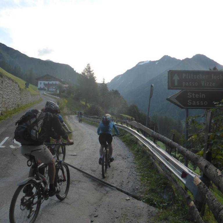 Im Tal angelangt fuhren wir an der Brennerautobahn ein Stück nach Norden bis wir sie durch einen Tunnel unterqueren konnten. Damit das Ganze nicht langweilig wurde kam natürlich der nächste Anstieg zum Schlüsseljoch auf 2212 m. Leider wurde für den Nachmittag Gewitter vorausgesagt. Mal schauen wie weit wir kommen würden. Da wir zu dem Zeitpunkt schon ca. 1300 Höhenmeter in den Füßen hatten, ging der Anstieg nicht mehr ganz so locker und flockig. In einer kleinen Alm auf knapp 1700 m machten wir Rast und genossen eine Radler und Kaiserschmarrn. Leider zogen immer mehr Wolken auf und es sah nach Gewitter aus. Wir kamen dann noch bis zur Enzianhütte auf 1894 m als es auch schon donnerte und kurz darauf zu regnen anfing. Wir warteten das Gewitter bei einem Bier und Kaffee ab. Um kurz vor 17 Uhr fand sich ein Schönwetterfenster, das wir nutzen wollten. Nach der Hütte konnten wir noch ein paar Meter fahren, mussten dann aber auf schieben, dank dem steinigen Singletrail, übergehen. Leider donnerte es noch immer ganz in der Nähe, aber wir blieben von Regen verschont. Nach knapp einer Stunde Aufstieg erreichten wir das Schlüsseljoch, der Übergang zum Pfitschertal auf 2212 m. Hier blies ganz schön der Wind und überall sah es nach Regen aus. Unser reserviertes Übernachtungsziel, das Pfitscher-Joch-Haus hatten wir uns schon abgeschminkt. Auf einem sehr steinigem Singletrail sausten wir wieder gen Tal. Auch diese Abfahrt machte viel Spaß und verging wie im Flug. Brigitte meisterte alle Passagen, ob nach unten, wie auch nach oben, ohne Probleme. Ihre, wie aber auch die Technik der Männer wurde immer besser. Um kurz nach 6 Uhr erreichten wir das Pfitschertal in Fussendross. Wir fuhren noch 5 Kilometer bis nach St. Jakob, wo wir das letzte Zimmer in einer gemütlichen Pension ergatterten. Wir bekamen ein Viererzimmer mit Notbett, was für uns natürlich absolut ausreichend war. Die ganze Ortschaft war ausgebucht, da gerade die komplette Filmcrew des Filmes "Iceman" mit Jürgen Vogl hier residierte. Jürgen Vogl spielt den legendären Urzeitmenschen "Ötzi". Wir bezogen unser Zimmer und duschten, bevor wir ein leckeres Abendessen bekamen. Es gab Steak, Nudeln, Kartoffeln und dazu eine Flasche Hauswein. Da wir ganz schön bratfertig nach unseren 8 Stunden, 46 Kilometern und 2100 Höhenmetern waren, gingen wir schon um halb 10 Uhr ins Bett.
