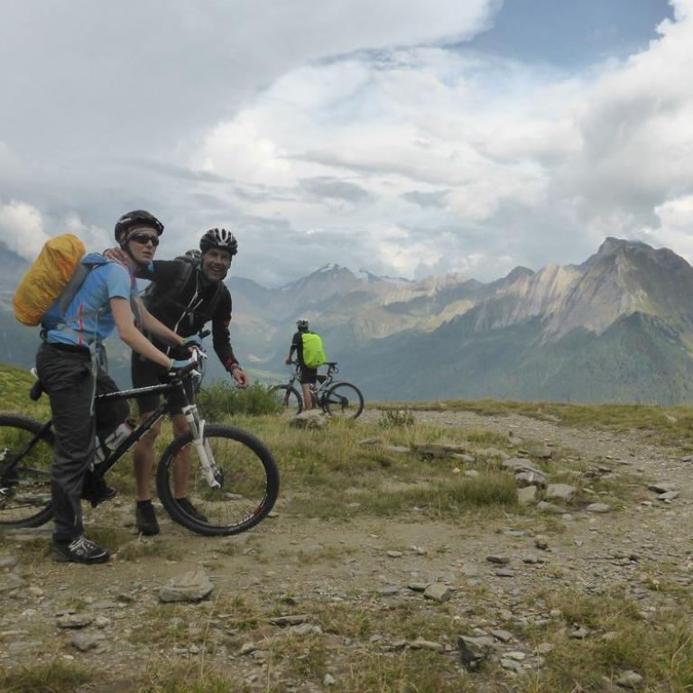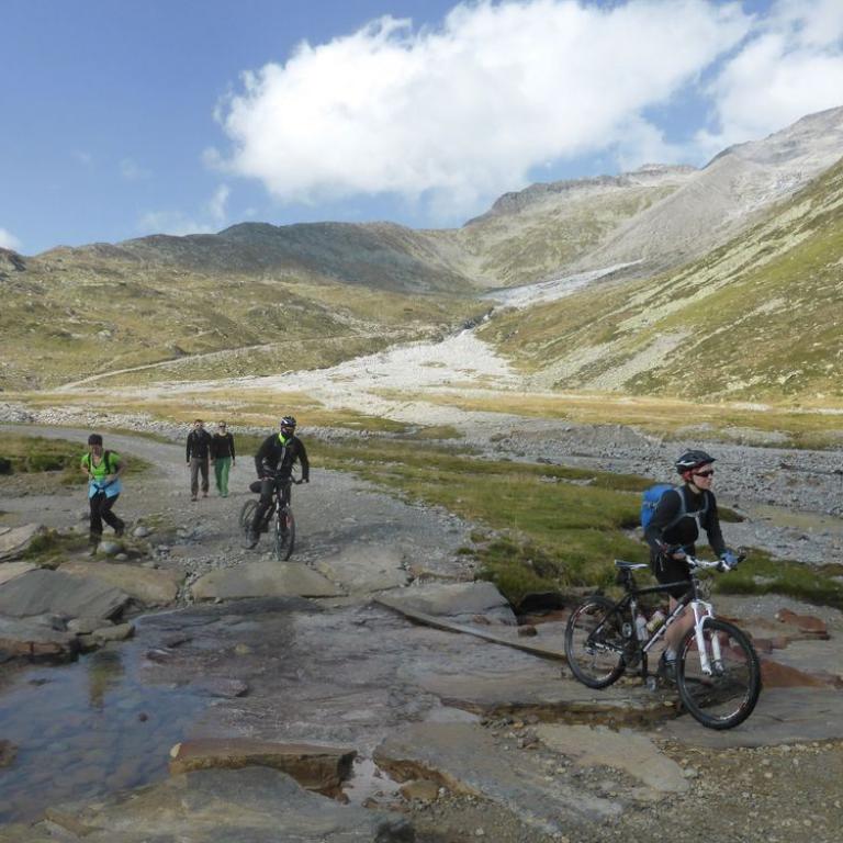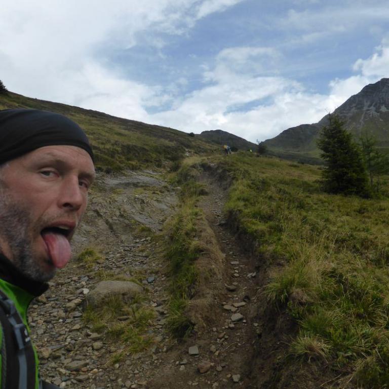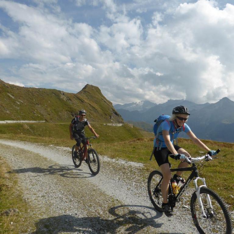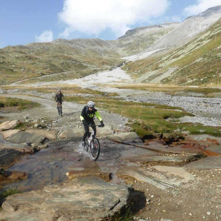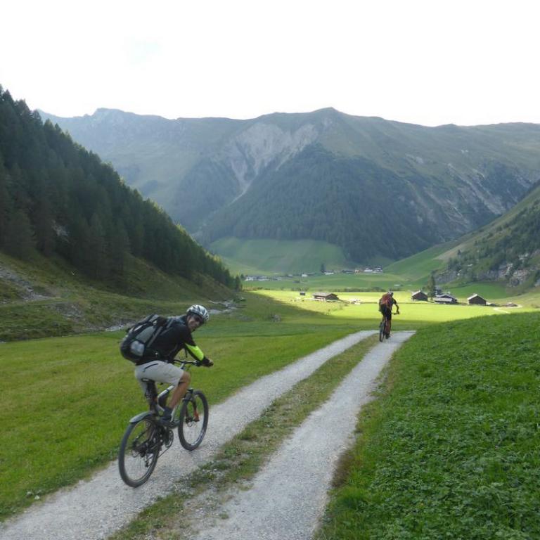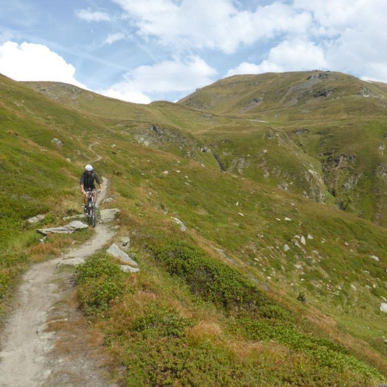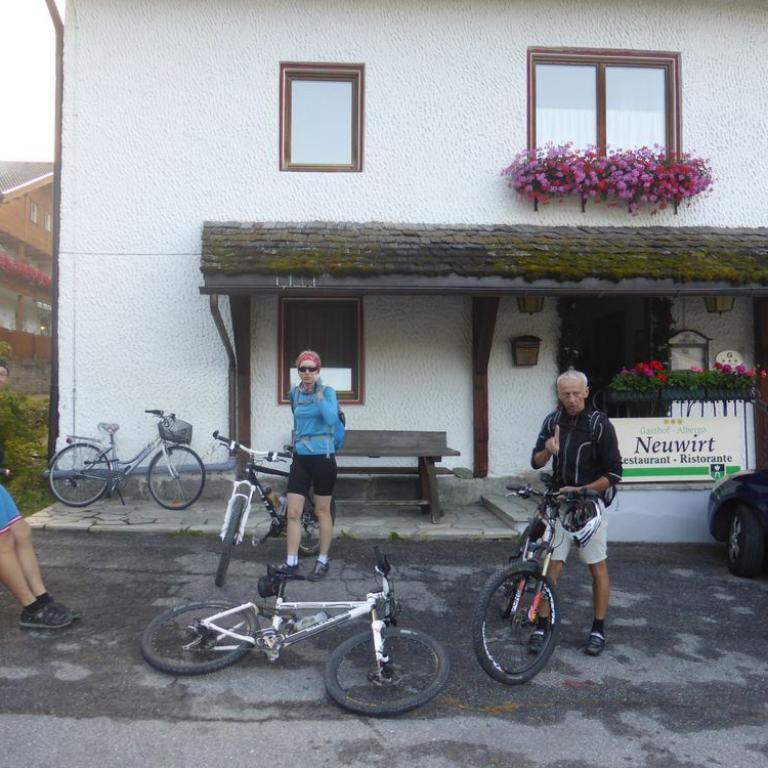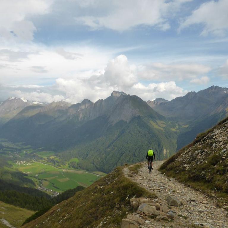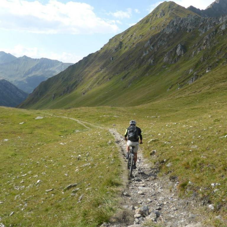 Im Tal angelangt fuhren wir an der Brennerautobahn ein Stück nach Norden bis wir sie durch einen Tunnel unterqueren konnten. Damit das Ganze nicht langweilig wurde kam natürlich der nächste Anstieg zum Schlüsseljoch auf 2212 m. Leider wurde für den Nachmittag Gewitter vorausgesagt. Mal schauen wie weit wir kommen würden. Da wir zu dem Zeitpunkt schon ca. 1300 Höhenmeter in den Füßen hatten, ging der Anstieg nicht mehr ganz so locker und flockig. In einer kleinen Alm auf knapp 1700 m machten wir Rast und genossen eine Radler und Kaiserschmarrn. Leider zogen immer mehr Wolken auf und es sah nach Gewitter aus. Wir kamen dann noch bis zur Enzianhütte auf 1894 m als es auch schon donnerte und kurz darauf zu regnen anfing. Wir warteten das Gewitter bei einem Bier und Kaffee ab. Um kurz vor 17 Uhr fand sich ein Schönwetterfenster, das wir nutzen wollten. Nach der Hütte konnten wir noch ein paar Meter fahren, mussten dann aber auf schieben, dank dem steinigen Singletrail, übergehen. Leider donnerte es noch immer ganz in der Nähe, aber wir blieben von Regen verschont. Nach knapp einer Stunde Aufstieg erreichten wir das Schlüsseljoch, der Übergang zum Pfitschertal auf 2212 m. Hier blies ganz schön der Wind und überall sah es nach Regen aus. Unser reserviertes Übernachtungsziel, das Pfitscher-Joch-Haus hatten wir uns schon abgeschminkt. Auf einem sehr steinigem Singletrail sausten wir wieder gen Tal. Auch diese Abfahrt machte viel Spaß und verging wie im Flug. Brigitte meisterte alle Passagen, ob nach unten, wie auch nach oben, ohne Probleme. Ihre, wie aber auch die Technik der Männer wurde immer besser. Um kurz nach 6 Uhr erreichten wir das Pfitschertal in Fussendross. Wir fuhren noch 5 Kilometer bis nach St. Jakob, wo wir das letzte Zimmer in einer gemütlichen Pension ergatterten. Wir bekamen ein Viererzimmer mit Notbett, was für uns natürlich absolut ausreichend war. Die ganze Ortschaft war ausgebucht, da gerade die komplette Filmcrew des Filmes "Iceman" mit Jürgen Vogl hier residierte. Jürgen Vogl spielt den legendären Urzeitmenschen "Ötzi". Wir bezogen unser Zimmer und duschten, bevor wir ein leckeres Abendessen bekamen. Es gab Steak, Nudeln, Kartoffeln und dazu eine Flasche Hauswein. Da wir ganz schön bratfertig nach unseren 8 Stunden, 46 Kilometern und 2100 Höhenmetern waren, gingen wir schon um halb 10 Uhr ins Bett.