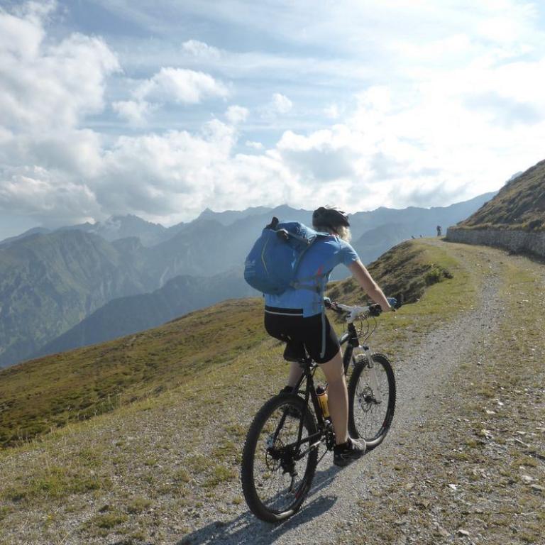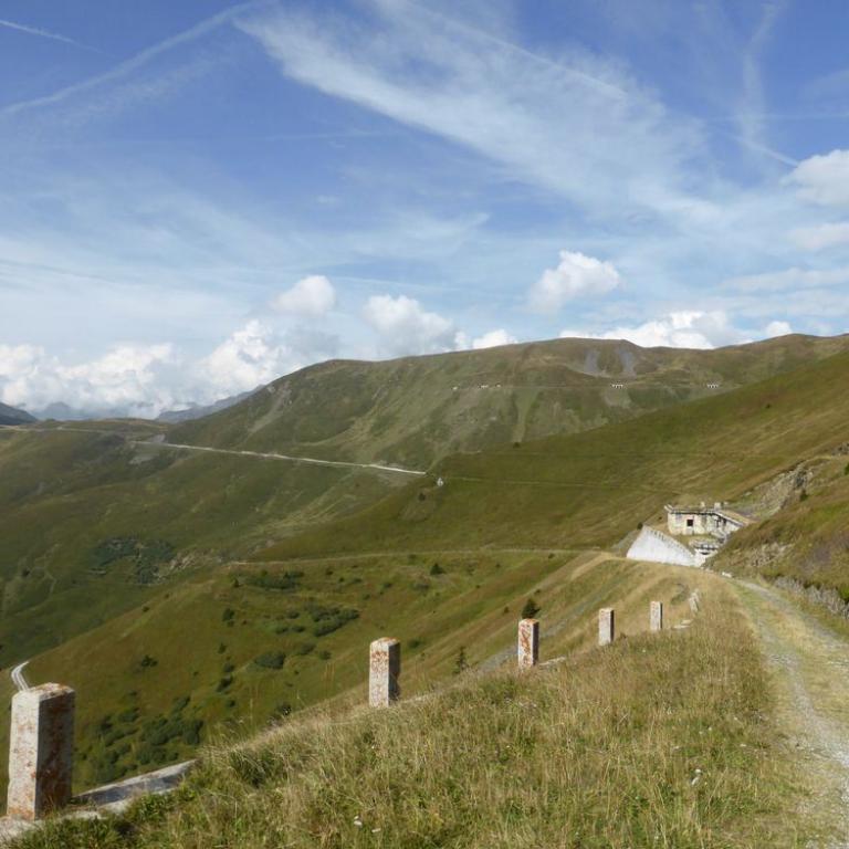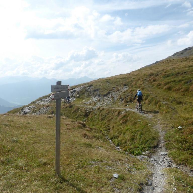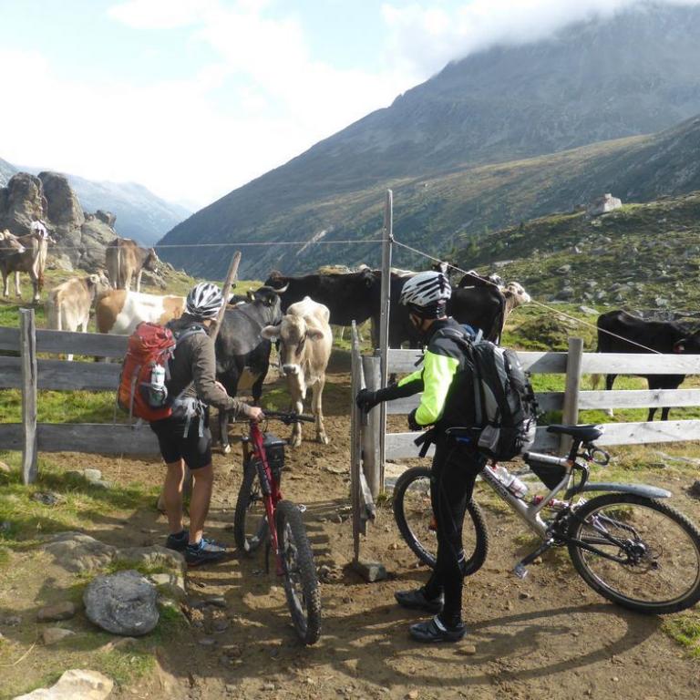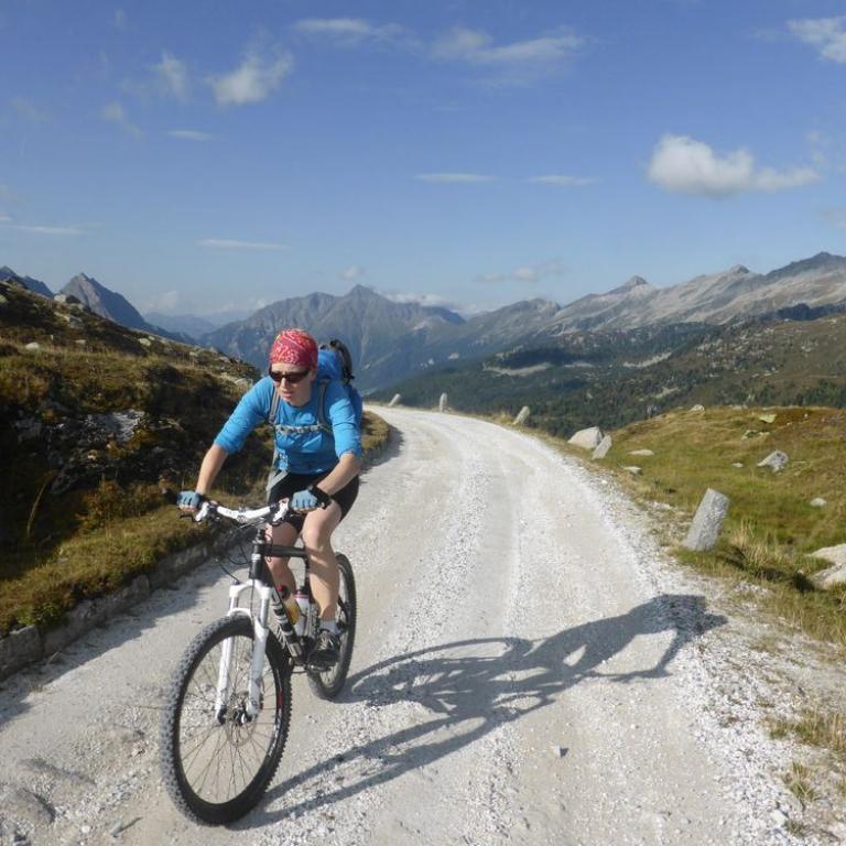 Obwohl die ganze Nacht in der Nachbarsferienwohnung gefeiert wurde, hörte ich nichts und konnte super ausschlafen. Draußen war es um 7 Uhr noch ganz schön frisch, aber wir hatten strahlend blauen Himmel und die Sonne kam auch schon hinter den Bergen hervor. Nach einem richtig leckeren Frühstück mit allem was man sich wünschen kann, starteten wir unsere 2. Etappe. Zuerst fuhren wir einen Forstweg moderat steigen weiter nach oben. Wir kamen vorbei an Almwiesen und vielen, vielen Kühen, wo wir teilweise langsam vorbei schoben. Nach einiger Zeit wurde aus dem Forstweg ein steiler Alm und Wiesenweg bis zum Sattelberg auf 2115 m. Auch heute hatten wir wieder herrliches Wetter. An manchen Berggipfeln hingen ein paar Wolken. Wir radelten dann auf einer welligen Bergstraße immer über 2000 m entlang. Die Aussicht war herrlich und die Strecke machte richtig Spaß. Immer wieder kamen wir an Bunkeranlagen aus dem 1. und 2. Weltkrieg vorbei. Wir fuhren zum Kreuzjoch auf 2242 m und weiter zum Sandjoch auf 2165 m. Hier mussten bzw. durften wir einen spannenden Singletrail nach Gossensass auf 1088 m abfahren. Fast alles war befahrbar und machte riesig Spaß.