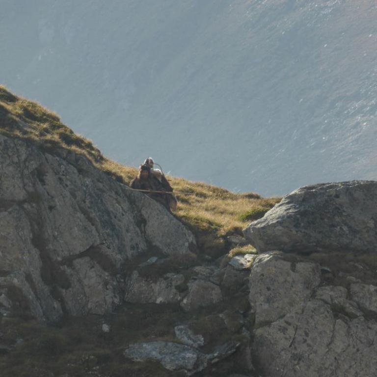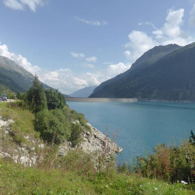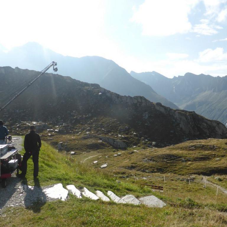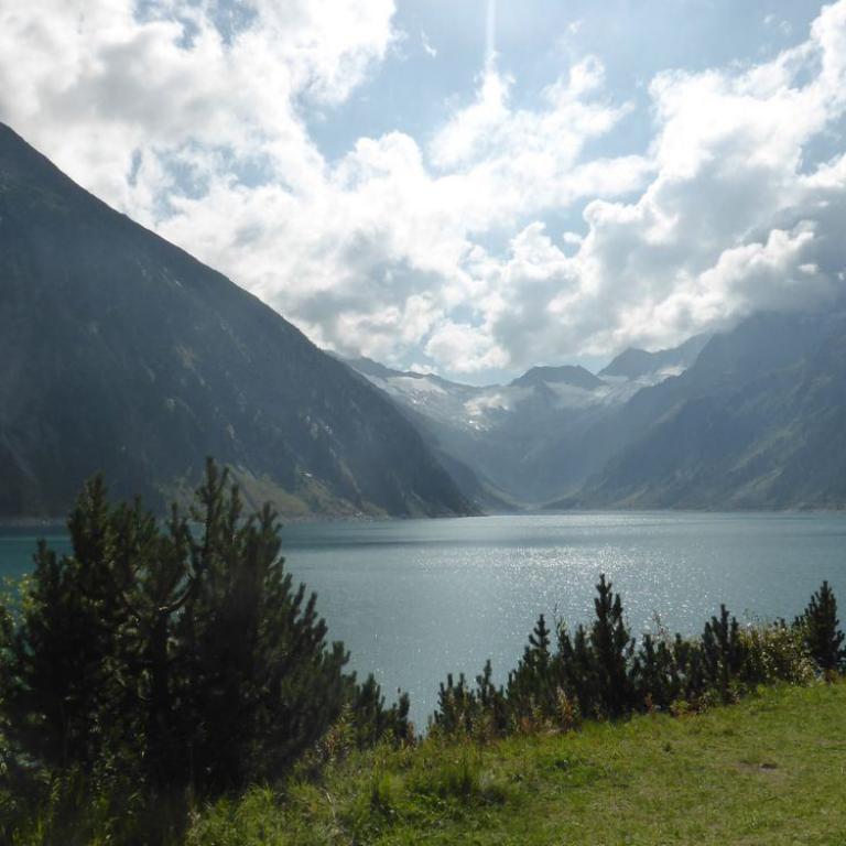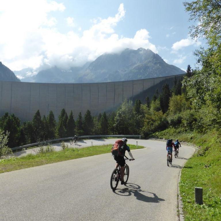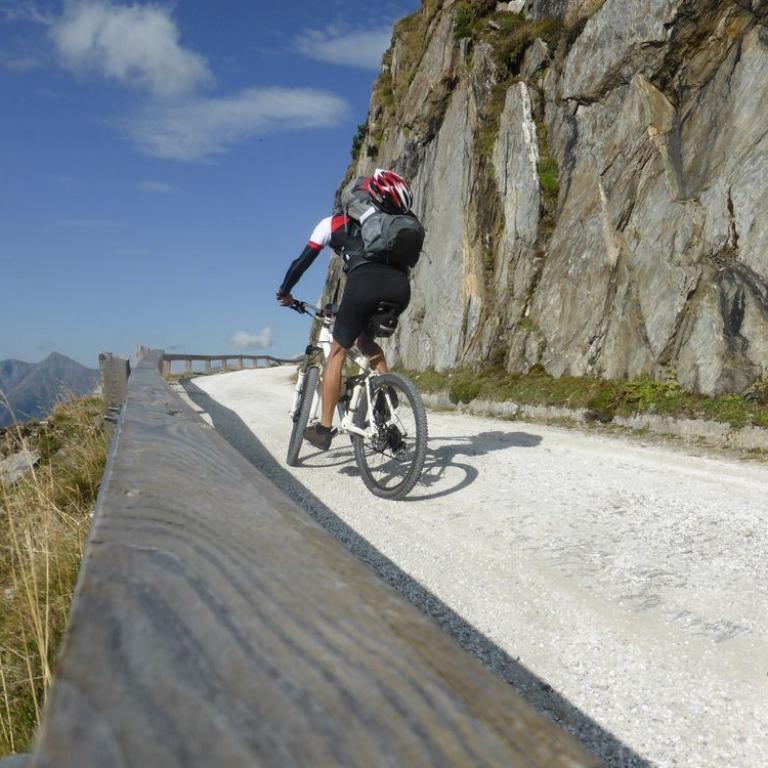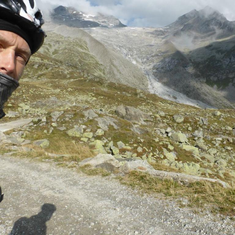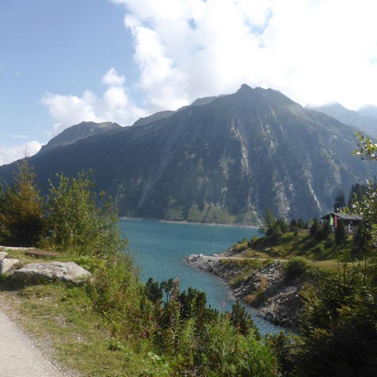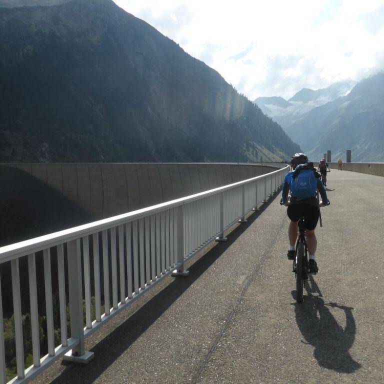 In der Nacht hatte es noch ziemlich geregnet, aber der heutige Morgen war wieder herrlich. Blauer Himmel, Sonne, nur ein paar Wolken hingen an den Bergen. Nach dem Frühstück um 7 Uhr saßen wir auch schon wieder auf unseren Rädern. Jedem tat der Hintern und verschiedene, andere Körperstellen weh. Aber trotzdem machte das Radeln wieder Spaß. Es war ganz schön eisig und Handschuhe wären nicht schlecht gewesen, aber nach 5 Kilometer welliger Strecke kam auch schon der Anstieg zum Pfitscher Joch. Die Serpentinen schlängelten sich nach oben. Zuerst noch im Wald und dann über der Baumgrenze mit traumhafter Aussicht auf die Berge. Nach knapp über zwei Stunden 10 km und 800 Hm erreichten wir dann das Pfitscher-Jochhaus auf 2275 m. Hier machten wir kurz Rast, zogen uns um und beobachteten die Dreharbeiten zum "Iceman". Jürgen Vogl stieg gerade auf den Felsen rum und ich machte natürlich Fotos. Lange hielten wir uns nicht, da es hier oben ziemlich eisig war. Bergab führte uns ein steiniger, aber gut befahrbarer Singletrail ins Zillertal bis zum Schlegeisspeicher auf 1782 m. Hier war es wieder warm und sonnig und an einer kleinen Hütte machten wir Rast und aßen eine Kleinigkeit. Ab dem Stausee fuhren wir direkt auf der Straße nach unten, was ebenfalls viel Spaß machte. Mit einer Affengeschwindigkeit sausten wir die Serpentinen nach unten. Wir kamen durch dunkle Tunnels, was ohne Licht eher spannend war. Nach 1600 Höhenmeter und 30 Kilometer Bergabfahrt erreichten wir dann Finkenberg. Hier entschlossen wir uns, dass Hans, Wolfi und Brigitte in einem Wirtshaus einkehren und Hans und ich ohne Rucksack die 10 Kilometer und 650 Höhenmeter nach oben zum Ausgangspunkt in Vorderlanersbach drückten. Nach einer Stunde Kampf erreichten wir unsere Autos, wo wir die Räder einluden und zu den anderen zurück fuhren. Nach der 3. Etappe hatten wir 53 km und 1700 Höhenmeter auf der Uhr stehen. Insgesamt waren wir 142 km 5600 Höhenmeter in 19 Stunden auf 3 Tage verteilt, unterwegs. Um kurz nach 14 Uhr machten wir uns wieder auf die knapp 4 stündige Heimreise.