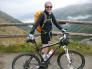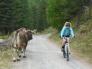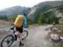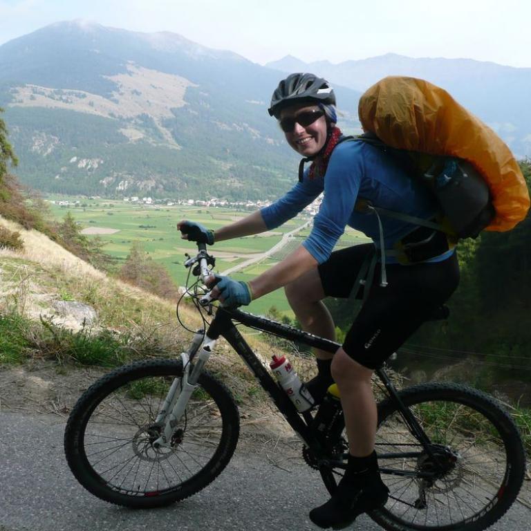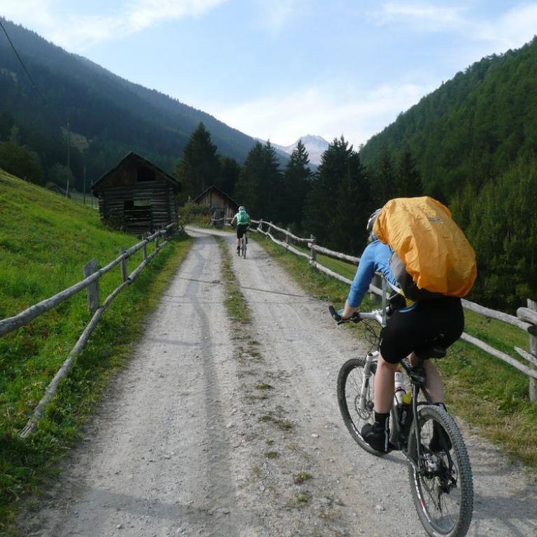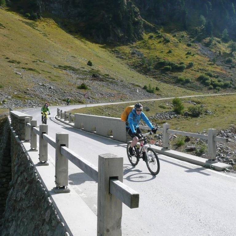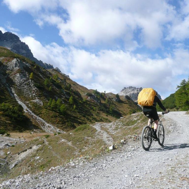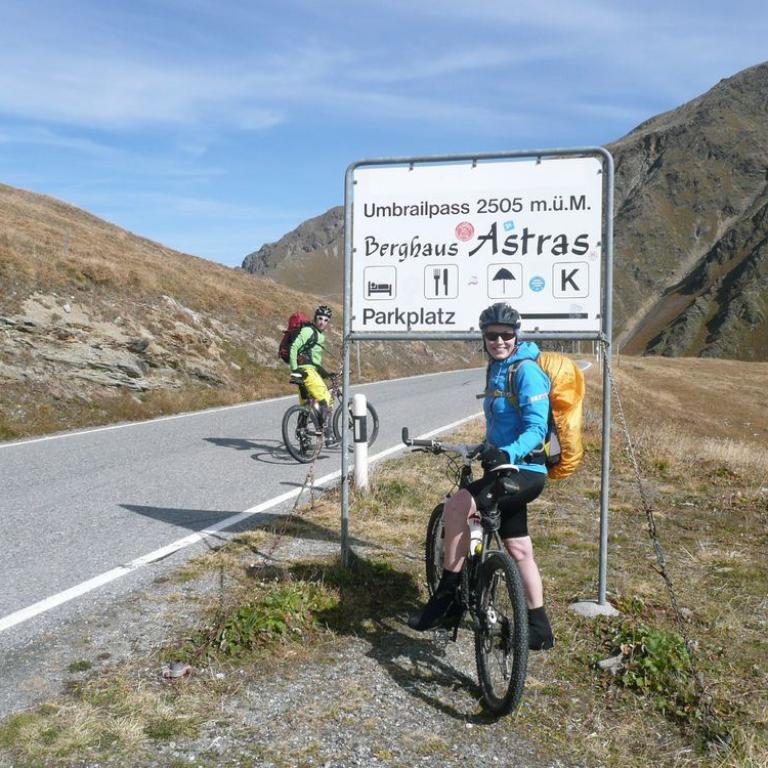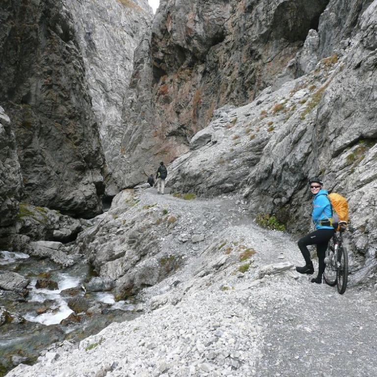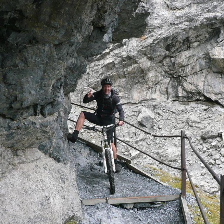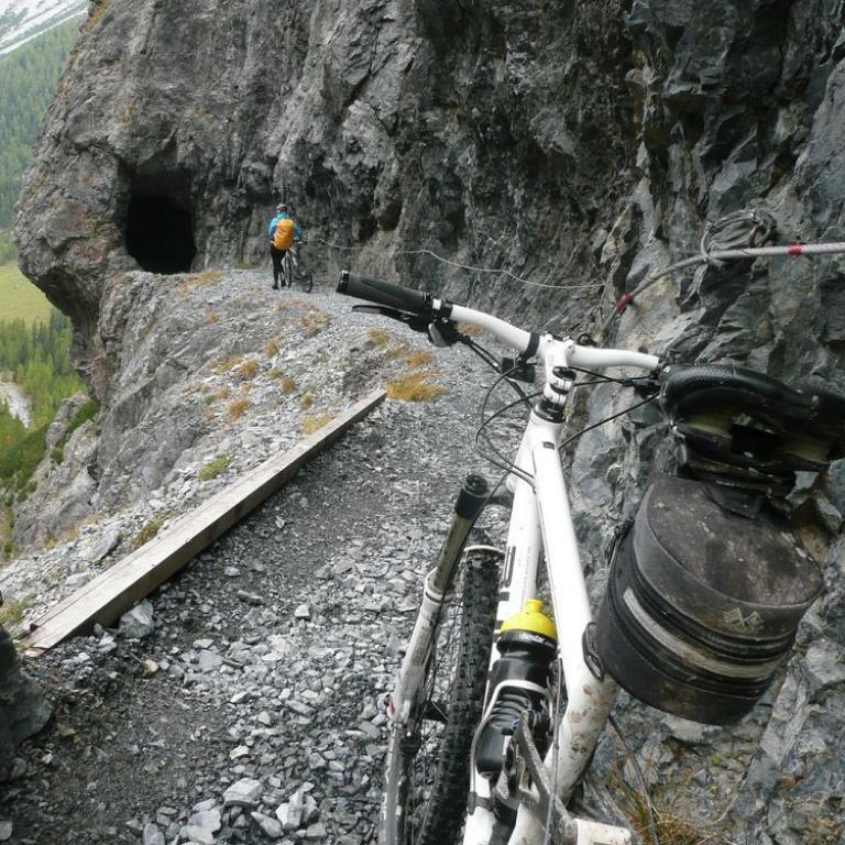 Nicht ganz so frisch saßen wir um kurz nach 7 Uhr beim Frühstück. Mit schweren Füßen (war der Wein oder die Höhenmeter vom Vortag Schuld?) fuhren wir weiter. Zuerst fuhren wir auf einer Teerstraße bis ein Wanderweg steil nach oben führte. Kurz vor einem Wasserfall war nur noch schieben möglich, da 30 Prozent Steigung einfach zu viel waren. Die letzten Meter zur Sesvenna Hütte auf 2256 m konnten wir wieder fahren. Hier kauften wir uns einen Kuchen und Spezi. Nach kurzer Pause fuhren wir einen Singletrail teilweise durch kleine Bäche bis zum Einstieg in die Uinaschlucht. 1910 wurde ein 600 m langer Felsenweg in die senkrechte Wand geschlagen.