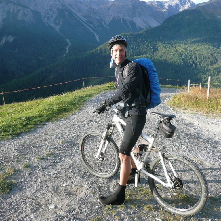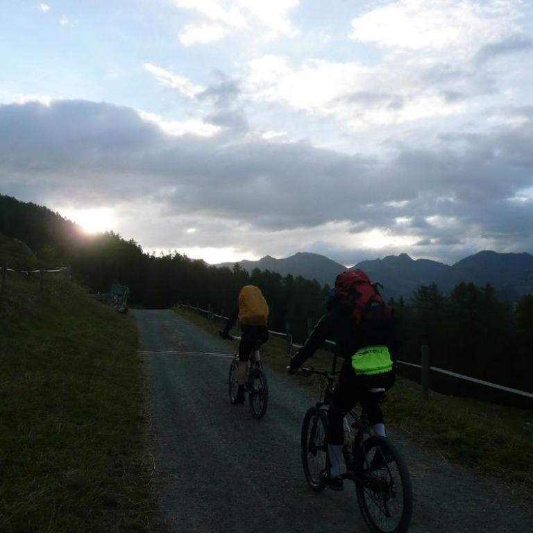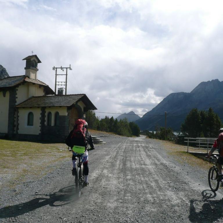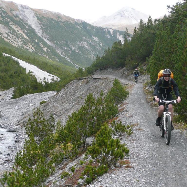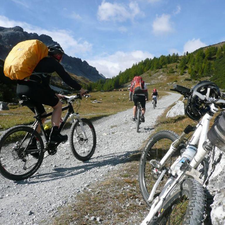 Schon um 5 Uhr fuhren Brigitte und ich in Schwarzach los. In Landau trafen wir uns dann mit Wolfi und Hans. Immer wieder regnete es während der Fahrt in die Schweiz. Es konnte nur noch besser werden. Um 11 Uhr erreichten wir das schweizerische Sur En auf 1141 m und zum selben Zeitpunkt hörte der Regen schlagartig auf. Am Campingparkplatz stellten wir unsere Autos ab. Mit Rucksack bewaffnet starteten wir unsere MTB Tour durch zwei Länder. Zuerst fuhren wir auf einem Radweg bis Scuol auf 1200 m. Über eine Teerstraße fuhren wir stetig nach oben bis es in einen Forstweg überging. Rechts von uns schlängelte sich ein Gebirgsbach in Richtung Tal. Wir kämpften uns immer weiter bis wir das Bergdorf S-charl erreichten. Hier kehrten wir auf einen Kaffee und Kuchen ein, bevor es weiter auf die Strecke ging.