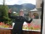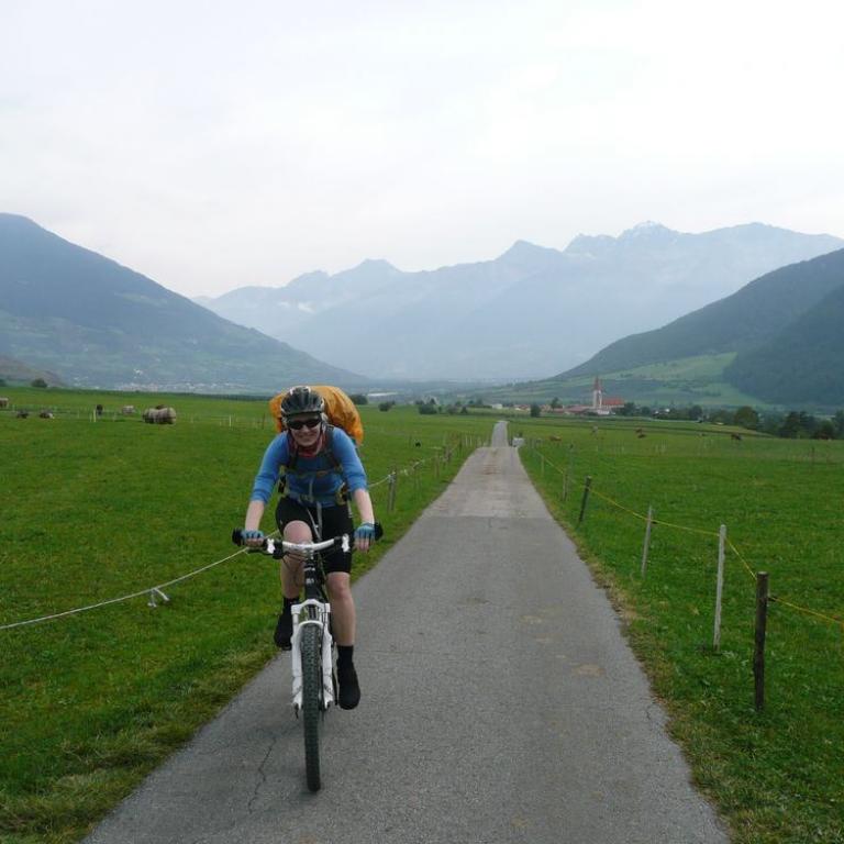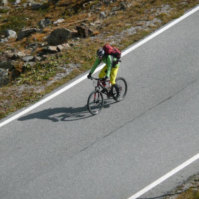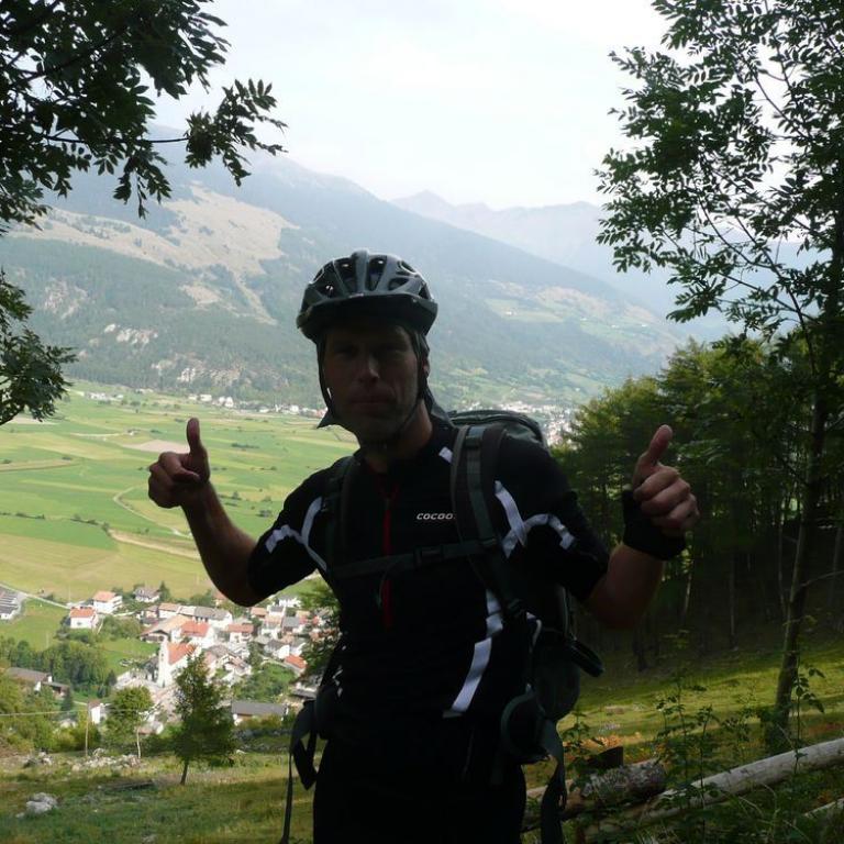 Nach einer kurzen Pause sausten wir die Serpentinen wieder nach unten und bogen dann Richtung Umbrailpass (2501 m) zurück in die Schweiz ab. Rasant schossen wir ins Tal hinunter. Auf 1300 m erreichten wir wieder Santa Maria. Auf der Hauptstraße ging es bis Müstair und wieder über die Grenze nach Südtirol. Nach einer kurzen Einkehr in einem Cafè fuhren wir einen Forstweg bis Laatsch (900 m). Ab hier mussten wieder nach oben. Das Wetter war noch immer herrlich, fast etwas zu schwül. Unser nächstes Ziel war Schleis auf 1050 m. Hier entschieden wir uns, das auch noch Schlinig auf 1700 m fallen musste. Zuerste führte uns eine Straße steil nach oben, die dann in einen Waldweg überging. Wir hatten einen traumhaften Blick in die Vinschgau. Teilweise wurde es immer steiler. Wir waren ganz schön am Ende, aber trotzdem purzelten die Höhenmeter. Nach weiteren 2 Stunden und 700 Höhenmetern sahen wir das Ortsschild von Schlinig. Ich war Stolz wie Oskar auf Brigitte, das sie 2700 Höhenmeter und 63 km in einem Stück gemeistert hatte. Wir suchten das Hotel "Edelweis", wo wir schon 2011 mit dem Alpenverein Straubing waren. Nach der super gelungenen Tour genehmigten wir uns ein Weißbier auf dem Balkon. Das 3 Gänge Abendessen war lecker und der Wein schmeckte um so besser. Nach einer ganzen Menge Wein und Siegerschnäpse später, begaben wir uns zur wohlverdienten Nachtruhe.
