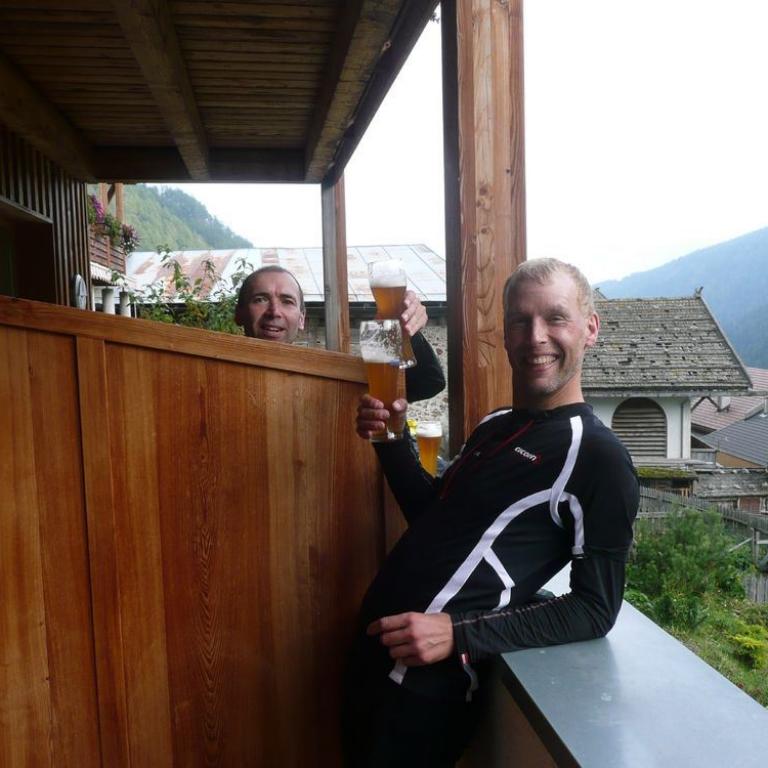 Hier fanden wir zuerst trotz Garmin und Karte nicht den richtigen Weg und sammelten dadurch ein paar Bonushöhenmeter. Leider fing es dann ziemlich stark zu regnen an. Auch unsere Mägen knurrten, aber sämtliche Hütten und Restaurants waren geschlossen. Es blieb uns nichts anderes übrig, als weiterzu fahren bis wir in Richtung Bormio kamen. Steil nach unten führte uns ein nasser und dadurch rutschiger Weg, bis wir die Straße zum Stilfser Joch auf 1470 m erreichten. Von hier fuhren wir bis kurz vor Bormio, wo wir eine kleine, gemütliche Pension fanden. Da wieder die Sonne schien, genehmigten wir uns als erstes ein Bier auf der Terrasse, bevor wir die Dusche genossen. Am Abend aßen wir in einer naheliegenden Pizzeria lecker zu Abend und ließen den Tag ausklingen.