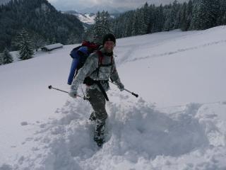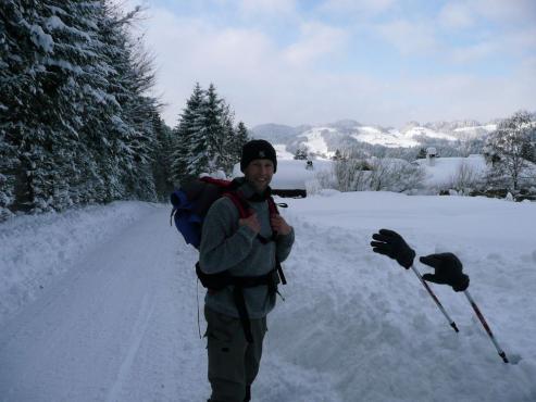 Wir fuhren gleich nach dem Frühstück in unserem Hotel am Walchsee nach Sachrang (ca. 30 Minuten Fahrt) und parkten unser Auto am Wanderparkplatz Geigelstein. Wir zogen uns warm an und legten die Schneeschuhe an. Zuerst ein kurzes Stück auf einer Forststraße, bogen wir dann nach links ab. Nach ein paar weiteren Minuten gelangten wir zu einer kleinen Diensthütte. Hier stößt der Weg von Huben auf die Forststraße. Weiter oben nahmen wir die Abkürzung zur Talalm, die aber etwas anstrengend wegen der Schneehöhe war. Über Almen ging es dann weiter wieder in den Wald hinein. Kurze Zeit später erreichten wir ein Schild mit der Aufschrift: "Priener Hütte 15 Minuten". Die letzten Meter führten uns steil zur Hütte. Die 3 Stunden Aufstieg durch den Tiefschnee waren doch schon etwas anstrengend, so das wir uns entschlossen nicht weiter auf den Geigelstein zu wandern, was nochmals 400 Höhenmeter gewesen wären. Wir machten es uns in der warmen Gaststube bequem. Nach einer Stärkung ging es wieder auf dem Aufstiegsweg ins Tal zurück. Nach ca. 2 Stunden erreichten wir wieder unseren Wanderparkplatz.