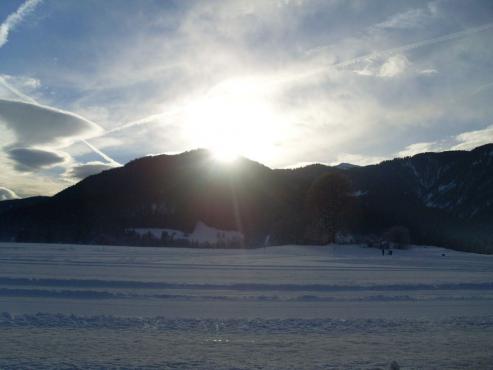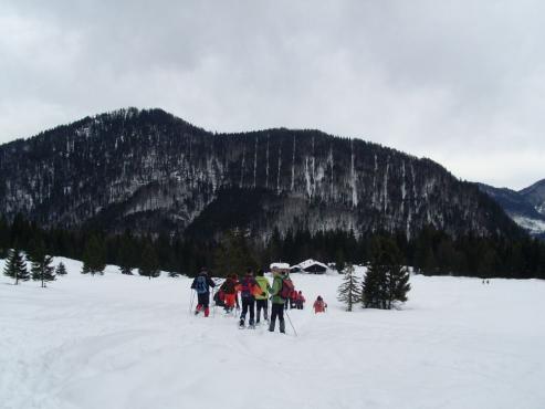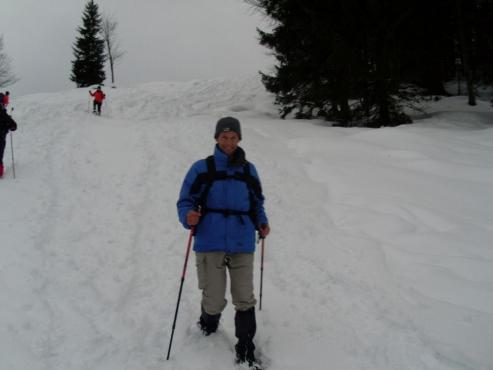 Um 10 Uhr Vormittags traffen wir uns in Reit im Winkl am Touristcenter mit unseren Kursleitern. Den Kurs buchte ich über das Internet bei Rosmarie Pichler für 40 Euro pro Person. Es waren noch ca. 20 andere Kursteilnehmer von 30 bis 60 Jahren am Treffpunkt. Wir hatten unsere Tchibo Schneeschuhe selbst dabei. Die meisten Anderen wurden erst noch eingekleidet mit Schneeschuhe und Teleskopstöcke. Wir wurden dann mit dem Unimog über eine steile, verschneite Straße abenteuerlich zur Hindenburghütte (Hemmersuppenalm) gebracht. Zuerst gab es eine kleine Einweisung wie man die Schneeschuhe an den Wanderschuhen am Besten befestigt. Dann ging es auch schon los, den Berg hinauf. Ganz so einfach wie ich es mir dachte war es nicht. Man sank doch relativ tief ein, wenn man selbst spurte. Hinter der Herde nach war es dann doch viel einfacher, weil in der Spur das Vorwärtskommen weniger anstrengend war. Nach kurzer Zeit waren wir auf dem Plateau angekommen. Von hier aus hatten wir auch einen herrlichen Ausblick zu den umliegenden Bergen der Chiemgauer Alpen. Wir lernten wie man am Besten einen Abhang hinunter kommt -> Auf dem Hintern. Das ganze war echt lustig. Nach ca. einer Stunde machten wir Rast bei einer Alm, die aber geschlossen war. Es gab Tee und eine Semmel. Nach einer kurzen Pause marschierten wir weiter. Die meiste Zeit ging es eben dahin. Nachdem wir eine ganze Weile auch durch den Wald gingen, erreichten wir eine Alm, wo wir einkehrten und uns etwas leckeres zum Essen kauften (Hirschgulasch gabs bei mir). Nach ca. 1 Stunde machten wir uns auf den Rückweg ins Tal. Wir mussten einige Abhänge hinunter. Es war lustig zu sehen wie manche in den Schnee sausten. Bergab läuft man am Besten mit den Schneeschuhen. Um ca. 16 Uhr erreichten wir das Tal. Mit dem Bus wurden wir wieder nach Reit im Winkl transportiert.