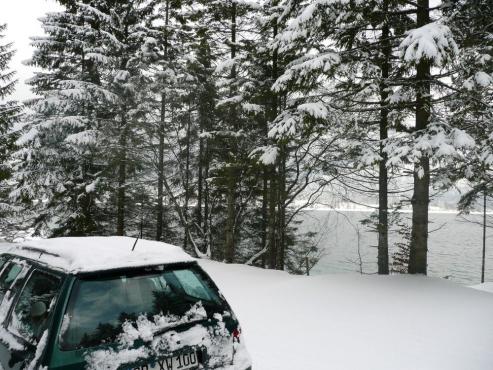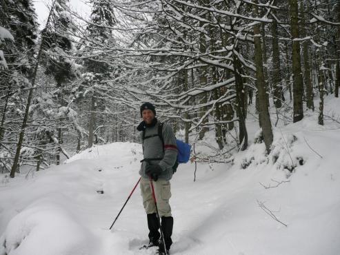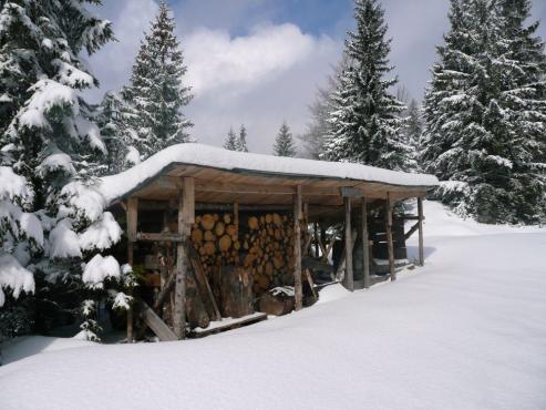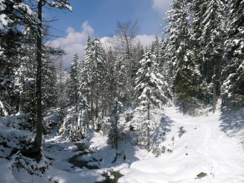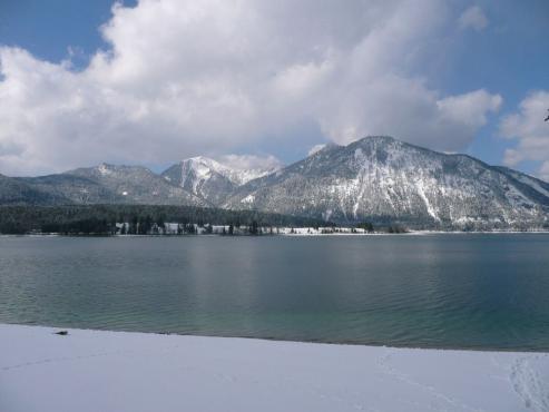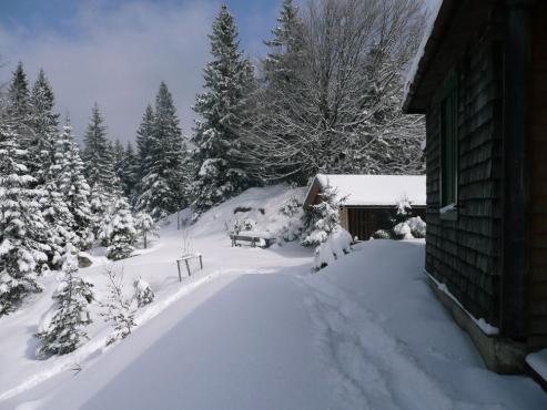 Nach dem das Wetter besser meldete, entschieden wir uns eine Schneeschuhtour auf den Hochkopf (1299 m) zu unternehmen. Wir fuhren von Obernach die Mautstraße in Richtung Altlach. Dort parkten wir unser Auto am Straßenrand und los ging es mit den Schneeschuhen eine Forststraße Richtung Altlacher Hochkopf. Immer wieder konnten wir die Sonne sehen. Teilweise kämpften wir uns durch den Neuschnee steil nach oben. Immer entlang an einem Bächlein. Markierungen halfen uns den Weg zu finden. Nach ca 1 1/2 Stunden Anstrengung durch den Tiefschnee erreichten wir wieder einen Forstweg. Leider mussten wir selbst spuren, da vor uns noch keiner den Weg nach oben gewagt hatte. Der Wegweiser führte uns weiter durch den Tiefschnee aber doch herrliche Winterlandschaft weiter nach oben. Nach einer weiteren Stunde Aufstieg erreichten wir dann auf 1299 m die sogenannte König-Ludwig-Hütte, in der bereits König Ludwig II verweilte und bei Vollmond romantische Ausritte rund um die Hütte genoß. Nach einer kurzen Rast wanderten wir wieder talabwärts. Dies war wieder etwas leichter, da wir in unseren Spuren wanderten und natürlich weil es bergab ging. Nach ca. 2 Stunden erreichten wir wieder unser Auto.