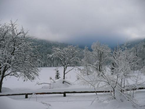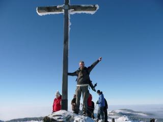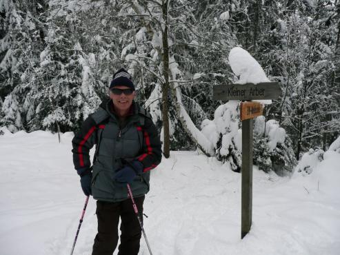 Um 9 Uhr Vormittags starteten wir unsere Schneeschuhtour am Parkplatz in Brennes. Zuerst wanderten wir auf Forststraßen bis zum kleinen Arbersee. Alles war in Wolken und wir hatten keine Sicht auf die Gipfel. Vom Arbersee folgten wir den Skitourenspuren aufwärts Richtung kleinen Arber. Beim kleinen Arbersee rechts am Ufer entlang zur Seehütte. Bei der Seehütte auf Hauptwanderweg (Markierg. grünes3-Eck) zuerst auf einem Steig, dann auf dem Forstweg zum kleinen Arber/Chamer Hütte. Durch den hohen Schnee kamen wir nur mühsam vorwärts. Ca. 150 Hm unter dem Gipfel des kleinen Arber wurden wir von blauem Himmel und herrlichem Sonnenschein überrascht. Die letzten Meter gingen ziemlch steil auf den Gipfel. Es waren leider nicht viele Spuren vorhanden. Auf dem Gipfel hatten wir eine super Fernsicht. Zuerst gab es noch Brotzeit. Dann stiegen wir zur Hütte ab und dann weiter auf den großen Arber. Hier war einiges los. Skifahrer tummelten sich auf der Arberschutzhütte. Wir bekamen noch einen Platz an der Sonne und genehmigten uns ein Weißbier. Um 15 Uhr stiegen wir dann neben der Skipiste wieder ab nach Brennes.