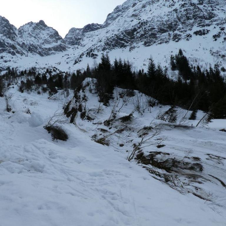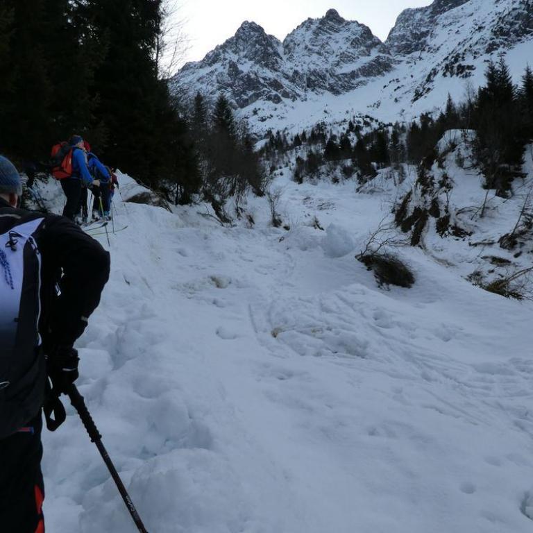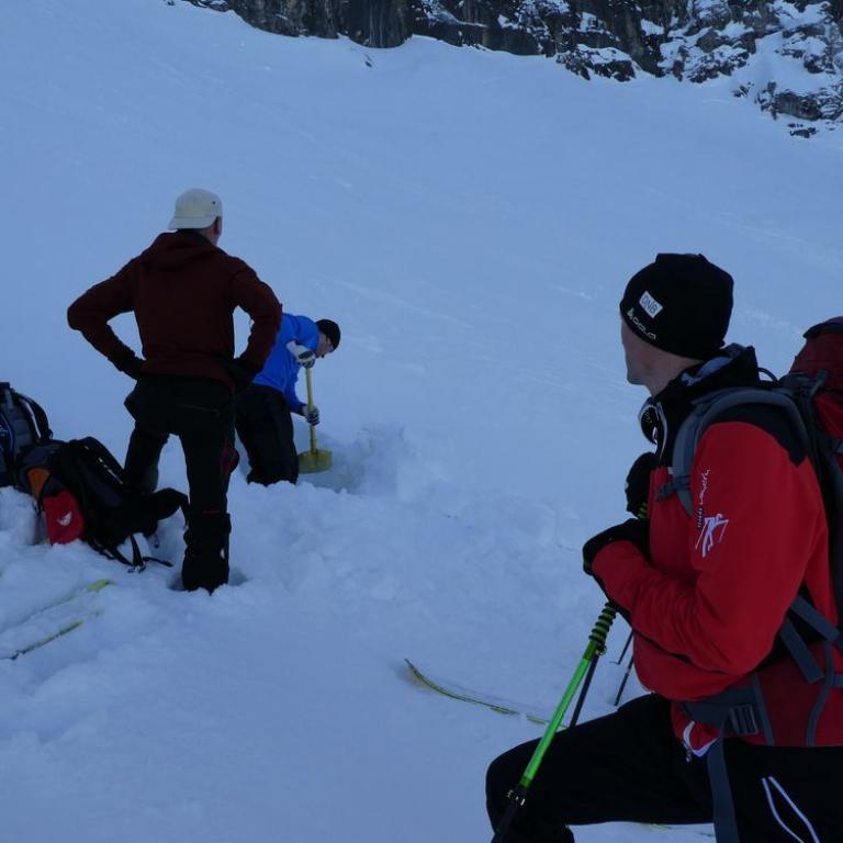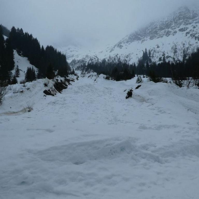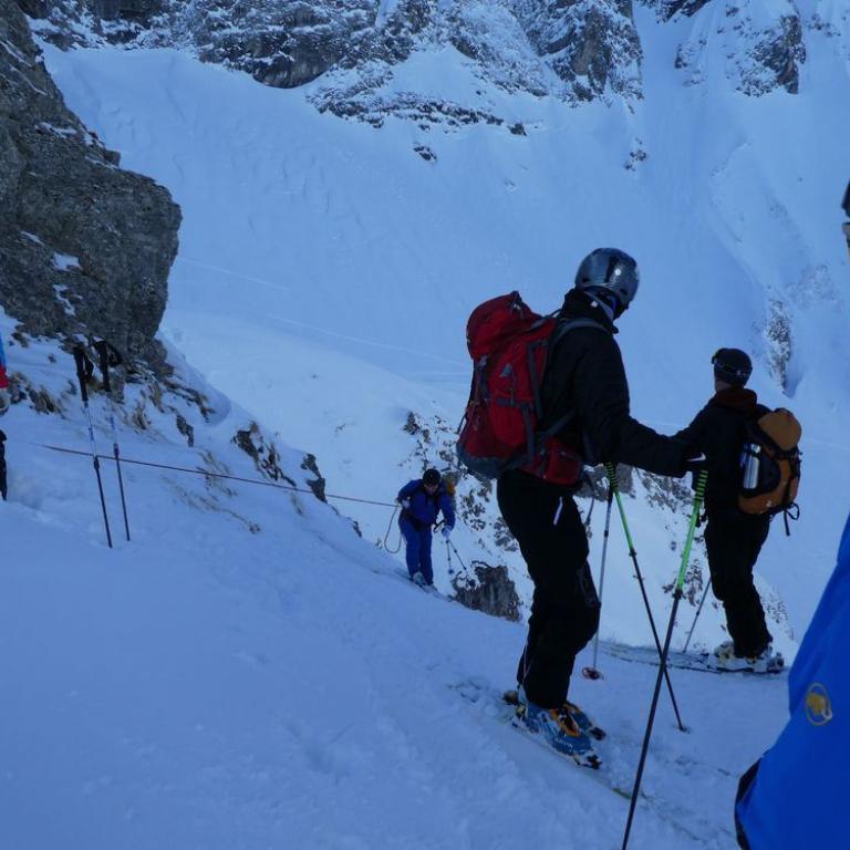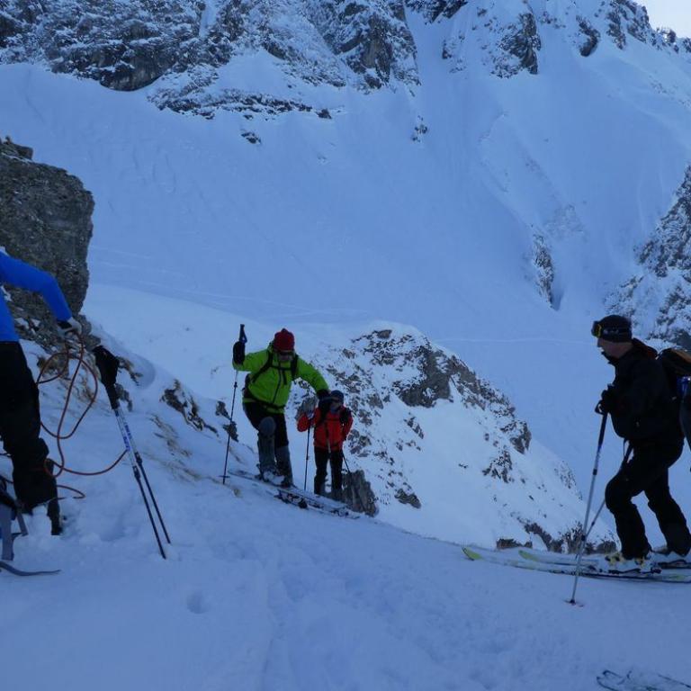 Zum vierten Mal fand nun schon Schwesis Kleinwalsertalwochenende statt. Zum vierten Mal waren Hans und ich mit dabei. Wir gehören ja schon fast zum Inventar :-) Dank eines privaten Termins kamen wir etwas zu spät, aber trotzdem bekamen wir noch ein leckeres Abendessen. Schwesi sprach mit uns die Samstagstour durch. Geplant war das Karlstor 2120 m und Ostseitige Abfahrt. Da aber das Wetter und auch die Bedingungen an der Scharte noch nicht klar waren, beschlossen wir dies kurzfristig zu entscheiden. Am nächsten Morgen sah das Wetter ganz vielversprechend aus. Blauer Himmel und leichte Minusgrade. Nach dem Frühstück trafen wir uns vor der Unterkunft. Nach dem LVS Check marschierten wir auf einer Forststraße durch das Bärgunttal. Bei der Widdersteinalpe bogen wir links ab und folgten einen Hang nach oben. Hier trafen wir auf eine, vor einiger Zeit, abgegangene Lawine, die eine Schnee und Dreckschneise nach unten gezogen hatte. Auch einige Bäume überlebten diesen Lawinenabgang nicht. Wir mussten teilweise über die Schneebrocken steigen. Der Schnee war ziemlich eisig und erschwerte uns dadurch den Aufstieg. Teilweise trugen wir unsere Skier durch ein steiles Waldstück. Wir kämpften uns durch ein schattiges Kar unter der Nordwand des Großen Widdersteins empor. Die Sonne kam langsam hinter den Bergen hervor. Der Himmel war blau und zeigte sich von seiner besten Seite. Da es steiler wurde, der Schnee ziemlich gefroren war und die Hangneigung über 35 Grad erreichte, entschieden wir uns Harscheisen zu verwenden, um den Aufstieg zu erleichtern. Immer weiter kämpften wir uns mit vielen Spitzkehren den vereisten Hang hinauf bis zum Karlstor. Nach 950 Höhenmetern Aufstieg erreichten wir die 2120 m hohe Scharte. Hier erstellte Schwesi ein Schneeprofil, um uns über die Beschaffenheit der Schneedecke zu informieren. Wir machten eine Pause bei herrlicher Aussicht und Traumskitourenwetter. Der Plan war, einige Höhenmeter Ostseitig abzufahren um dann wieder aufzusteigen. Nur der Blick blieb uns dank einer Schneewächte nach unten verwehrt. Schwesi entschied abzufellen und ein Stück abzufahren um hinter einem Felsen die Möglichkeit zu finden in den Osthang zu gelangen. Wir mussten einen kurzen, vereisten und steilen Hang queren um wieder ein paar Meter zur Scharte aufsteigen zu können. Schwesi war schon oben und ich versuchte mein Glück als Zweiter. Das Queren ging noch ganz gut, aber auf der Skikante das vereiste Stück nach oben zu steigen kostete enorm viel Kraft und wegrutschen war so nebenbei verboten :-) Schwitzend erreichte ich wieder die Scharte, wo wir diesmal in den Osthang einsehen konnten und auch eine Abfahrt möglich war. Schwesi vergrub seine Skier um daran ein Seil zu befestigen und den anderen den Aufstieg über das vereiste Steilstück zu erleichtern. Die Abfahrt in den über 35 Grad steilen Osthang war schon etwas pfiffig :-) Immer wieder mussten wir Lawinenbrocken umfahren, was nicht immer gelang und der ein oder andere deshalb im Schnee landete. Nach ca. 400 Höhenmetern fellten wir wieder auf um zurück zur Scharte aufzusteigen. Alles Training ganz klar :-)