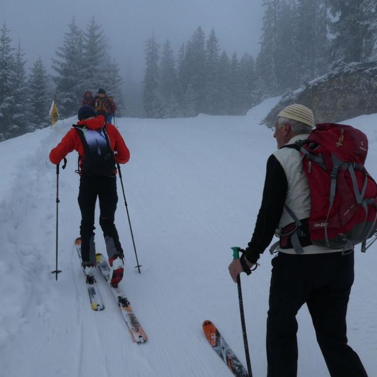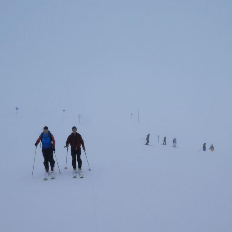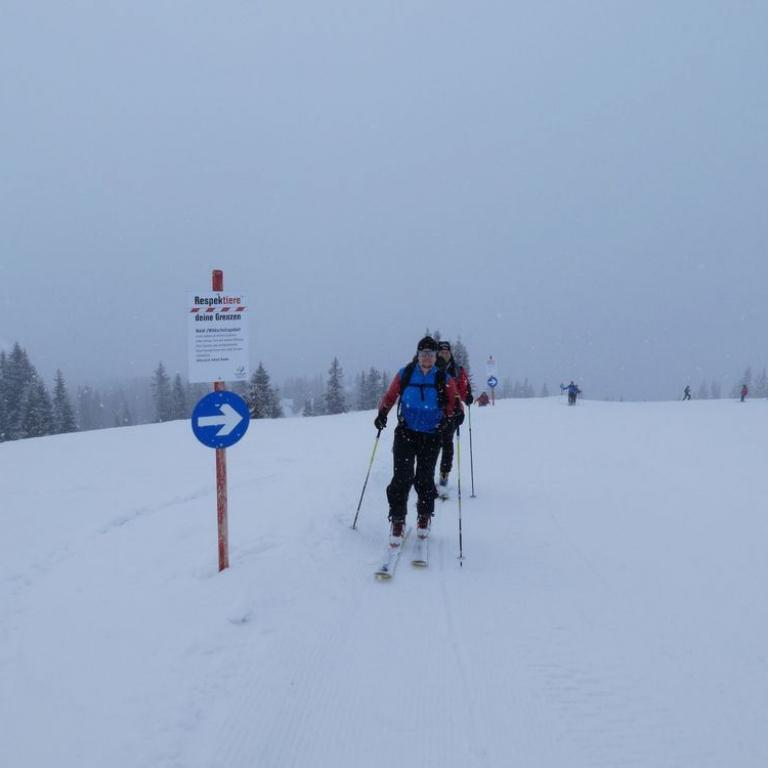 Der Sonntag zeigte sich bewölkt und mit leichtem Schneefall. Schwesi hatte leider ein Magendarmproblem, so dass wir alleine zur Tour aufbrechen mussten. Wir fuhren in das nahegelegene Skigebiet des Ifen, wo wir auf einer blauen Piste 800 Höhenmeter bis zur Bergstation aufstiegen. Die Sicht wurde immer schlechter, so dass wir uns gegen den Gipfel und für eine Alm entschieden. Danach fuhren wir zum Parkplatz ab, um die Heimreise anzutreten.