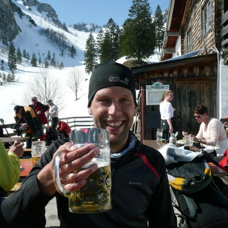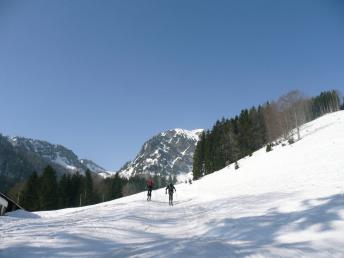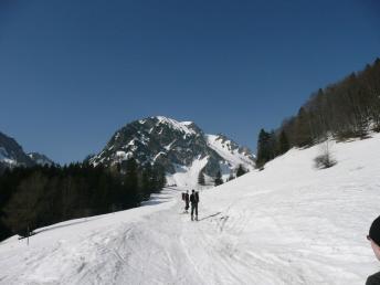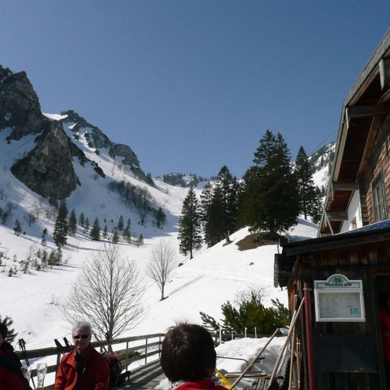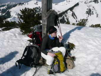 Bei herrlichstem Wetter fuhren Hans, Tom, Brigitte und ich nach Ettenhausen (Nähe Schleching), von wo aus wir den Breitenstein (Bayerische Voralpen) mit den Tourenskiern bestiegen. Bei Sonne, blauem Himmel und angenehmen Temperaturen konnten wir direkt vom Parkplatz starten. Über eine alte Skipiste ging es zuerst nach oben, bis wir an der Wuhrsteinalm vorbei kamen und weiter bis wir links einen steilen Hang empor mussten. An einer Scharte ließen wir unsere Ski stehen und marschierten noch bis zum Gipfel (1622 m), von wo wir eine herrliche Aussicht hatten. Die Abfahrt war für mich sehr schwierig, aber die Brotzeit auf der Alm entschädigte vieles. Insgesamt waren wir ca. 4 Stunden bei blauem Himmel und Sonnenschein unterwegs.