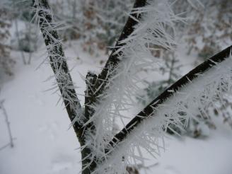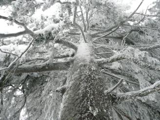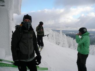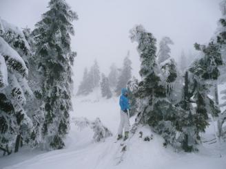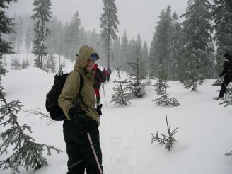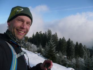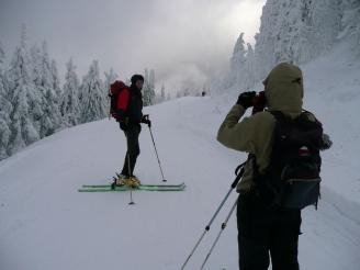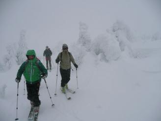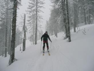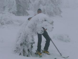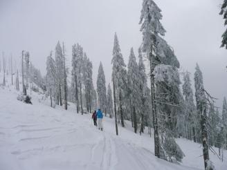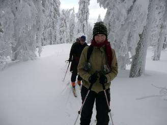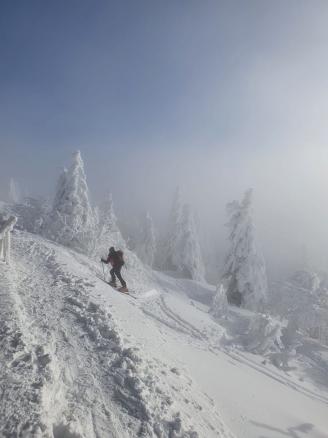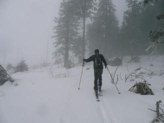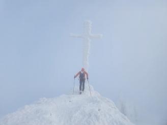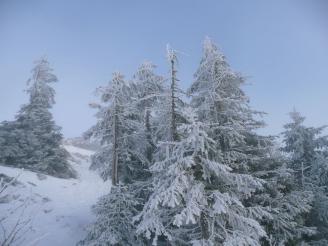 Obwohl wir fast nur im Nebel gingen, hatte auch diese Wetterlage seinen Reiz und die Bäume im Raureif boten ein bizarres Bild. Um ca. 14 Uhr erreichten wir den Arbergipfel und wurden von der Sonne, die sich durch den Nebel kämpfte, begrüßt. Es wehte ein eisiger Wind. Unterhalb des Gipfels machten wir Brotzeit vor einer Privathütte. Obwohl wenig Schnee lag konnten wir fast alles abfahren und mussten nur einmal die Ski ein paar Meter tragen.