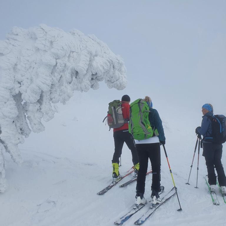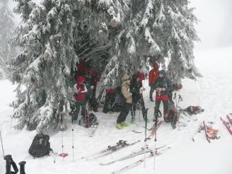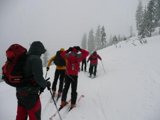 Durch ein Kreuz mit Skistöcken wird gekennzeichnet und dann mit der Sonde in ca. 30 cm. Abständen der Verschüttete gesucht. Der Kurs war sehr informativ und lehrreich. Im Anschluss bestiegen wir noch den Gipfel des großen Arbers bei starkem Schneefall und eisigem Wind. Die Abfahrt durch den Wald machte natürlich wie immer sehr viel Spaß. Später kehrten wir noch ein, da natürlich auch der Gesellige Teil nicht fehlen durfte.