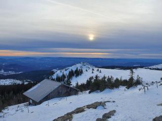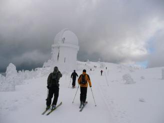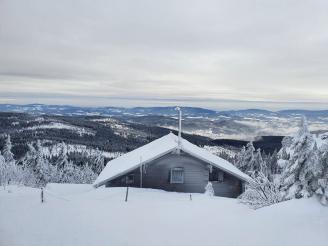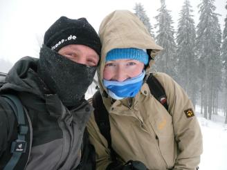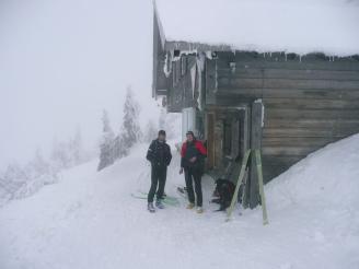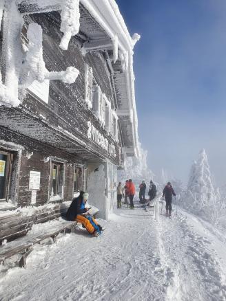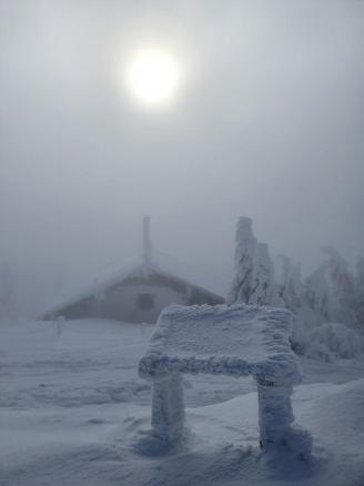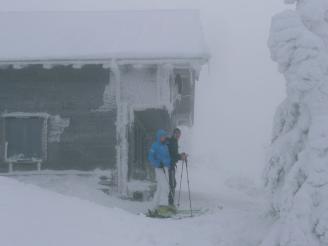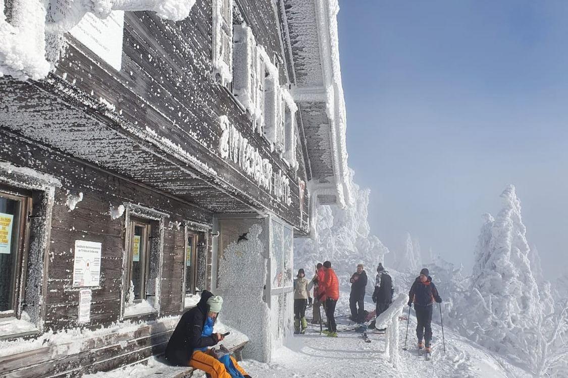 Ca. 100 Höhenmeter unterhalb des Gipfels konnte man die Sonne schon förmlich spüren, aber es reichte gerade nicht. An der Zwiesler Hütte deponierten wir die Skier und zogen uns frische und vor allem trockene Kleidung an. Es wehte der eisige, böhmische Wind.