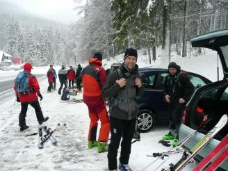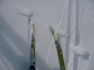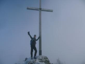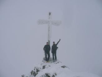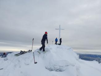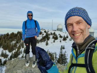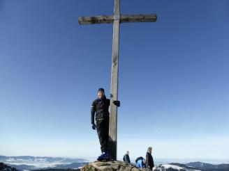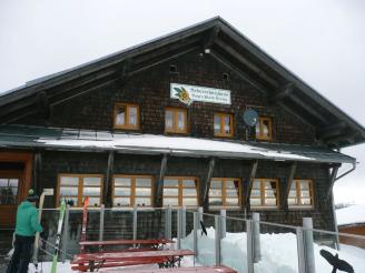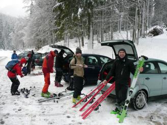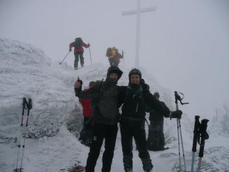 Oben angekommen wehte uns ein eisiger Wind entgegen. Unterhalb des Gipfels legten wir an einer Hütte die Felle zusammen und los ging es durch den herrlichen Schnee talwärts. Hans fand immer einen geigneten Weg so das wir wohlbehalten ohne größere Stürze wieder am Parkplatz ankamen.