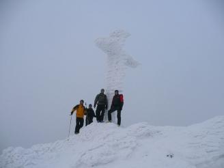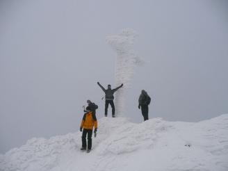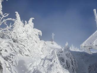 Hier blies uns der eisige, böhmische Wind ins Gesicht. Von hier stiegen wir dann auf den Arbergipfel mit dem vereisten Gipfelkreuz. Wir fuhren dann zur Arberschutzhütte ab, wo wir uns eine Brotzeit genehmigten. Mit einem Weißbier und Gulaschsuppe gestärkt stiegen wir nochmals zum Arber auf und fuhren dann auf dem Aufstiegsweg durch den idealen Pulver bis zum Parkplatz ab, wo wir Mittag auch schon wieder die Heimfahrt antraten.
