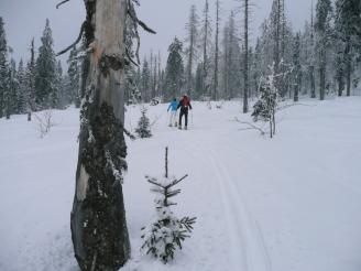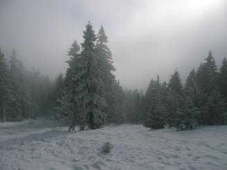 Aber als wir mit den Tourenskier links des Arbersees losmarschierten, stellten wir fest, dass der Neuschnee perfekt war. Da wir nicht die ersten waren, konnten wir einer Aufstiegsspur bis zum Mittagsplatzl folgen. Wir bewegten uns in einem traumhaften Winterwonderland. Nur leider ohne Aussicht, dank des Nebels und den Wolken.