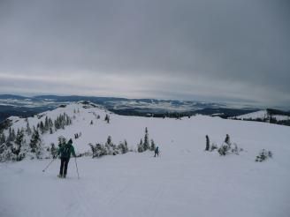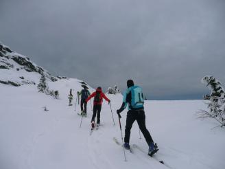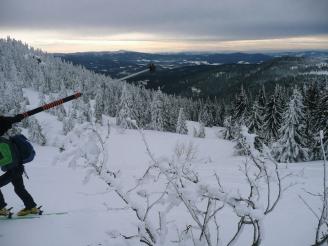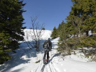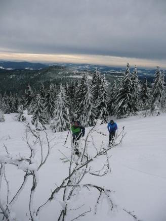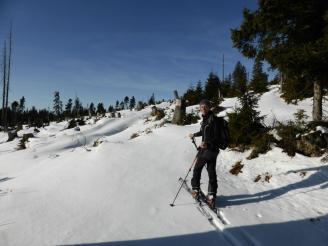 Der Wind blies uns fast vom Gipfel, aber die Temperaturen waren trotzdem relativ angenehm. Wir fuhren zuerst über die Piste ab, querten dann aber auf einen Wanderweg in Richtung Arbersee. Dank der niedrigen Schneedecke mussten wir teilweise unsere Ski tragen.