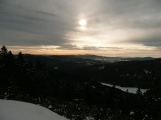 Tourbericht: Schon um 9 Uhr starteten Tom, Brigitte und ich am großen Arbersee. Bei herrlichen Bedingungen kämpften wir uns durch den Wald nach oben. Teilweise konnten wir den alten Spuren folgen. Von einer freien Fläche hatten wir einen schönen Blick auf den Arbersee. Leider sahen wir die Sonnen hinter den Wolken nur ansatzweise.