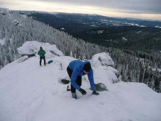 Das Wetter war zuerst noch ganz in Ordnung, aber es fing weiter oben immer mehr zu schneien an. In Richtung vom Mittagsplatzl erreichten wir eine große freie Fläche, wo wir LVS Geräte innerhalb eines Rucksacks im Schnee vergruben und mit Hilfe weiterer Geräte suchten, sondierten und wieder ausgruben. Zuerst geht der Suchende in die Richtung die das LVS Gerät anzeigt. Wenn dieser sich in ca. 10 Meter Nähe befindet geht man zum Landeanflug über, d.h. ändert nicht mehr die Richtung. Dann bleibt man am niedrigsten Wert und geht nach links bzw. rechts wieder zum niedrigsten Wert.