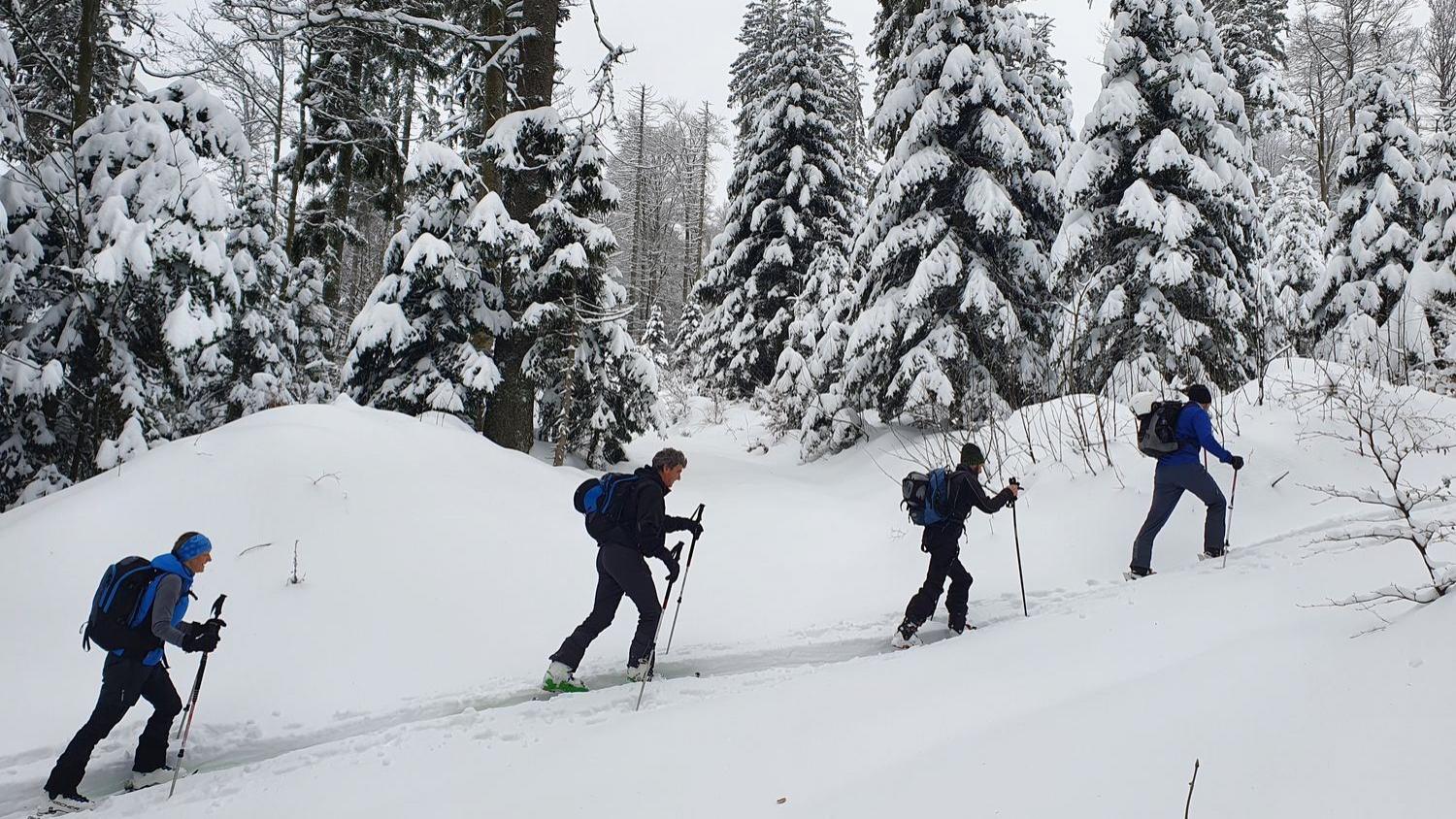 Schnee hatte es genug und das Wetter sah ganz vielversprechend aus. Wir klebten unsere Felle auf und schon waren alle 15 Mitglieder startbereit. Ernst und Birgit führten die Gruppe an. Zuerst am rechten Ufer des Arbersees entlang, führte der Weg nach oben. Über Forstwege und teilweise direkt durch den Wald erreichten wir eine freie Lichtung, von wo wir sehr schön den Arbersee sehen konnten.