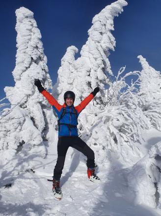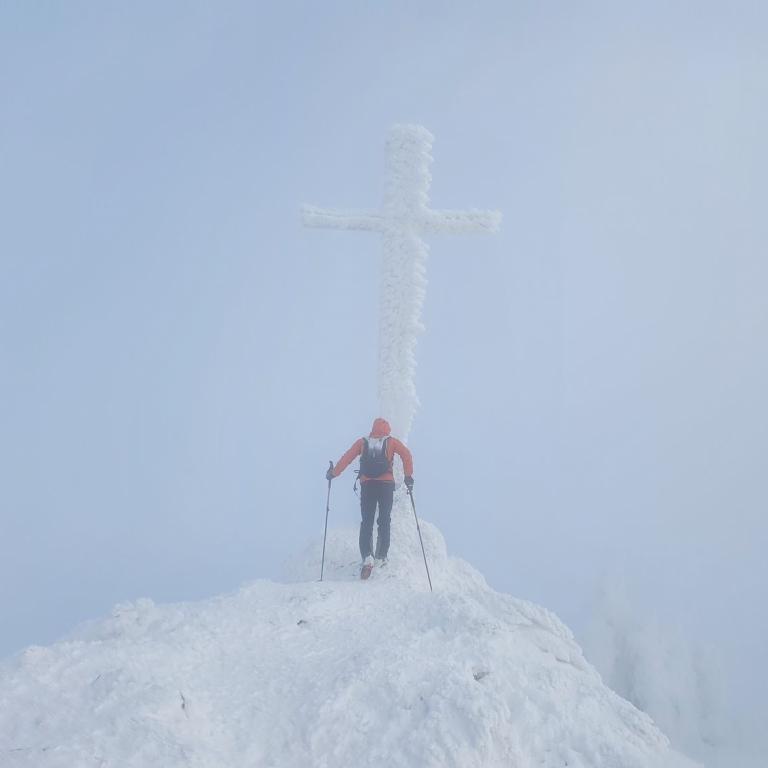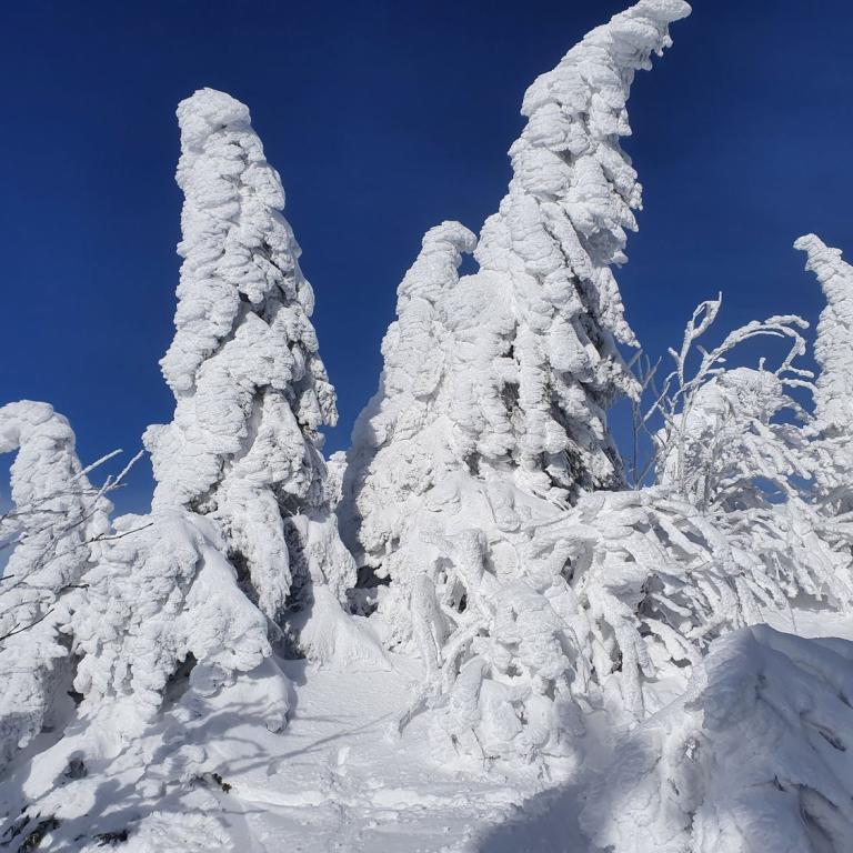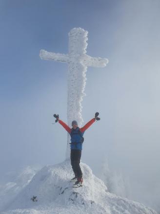 Wir stapften ohne Skier zum Gipfel hoch und der Skitouren-Gott meinte es gut mit uns. Die Wolken gaben den blauen Himmel frei und die Sonne streichelte uns über das Gesicht. Die vereisten Arbermandl strahlten in glitzerndem weiß. Wir machten viele Fotos von dieser Traumlandschaft.