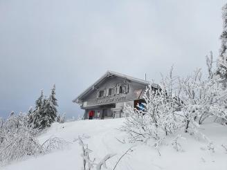 Dort machten wir kurz Rast und setzten unsere Tour in Richtung Chamer Hütte fort. Wir konnten den kleinen und großen Arber erkennen und somit wurde uns die ungefähre Richtung vorgegeben, da genau in der Senke dazwischen die Hütte liegt. immer wieder kam auch die Sonne heraus und verwöhnte uns mit wunderbaren Winterlandschaftsbildern. Nach ca. 3 Stunden erreichten wir die gut gefüllte Hütte, wo wir uns erstmal stärkten. Vollgegessen starteten wir den Aufstieg auf den Gipfel des Großen Arbers mit 1456 Meter.