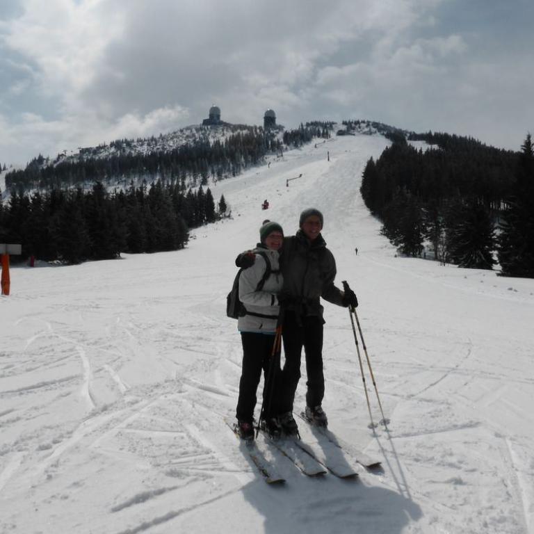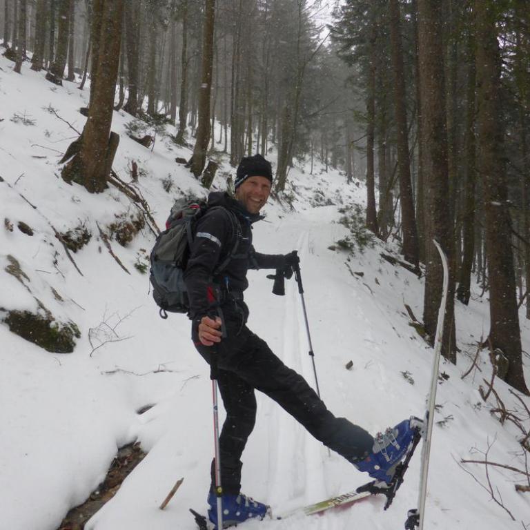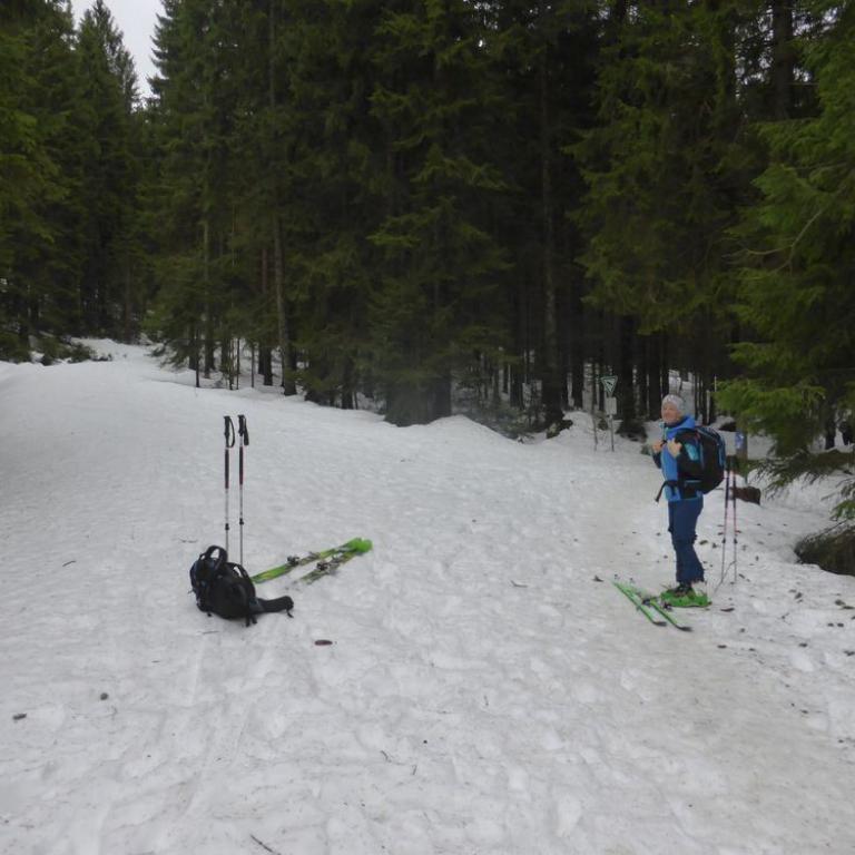 Tourbericht: Mit Hans und Margit fuhren Brigitte und ich am Ostermontag nach Brennes. Um kurz nach 9 Uhr standen wir bei leichten Sonnenschein auch schon auf den Tourenski. Von Brennes wollten wir eigentlich zum kleinen Arbersee und von dort auf den Kleinen Arber, aber gleich bei der ersten Gabelung ging ich den meisten Spuren nach, was ein Fehler war und wir uns immer mehr Richtung Großen Arber bewegten. Zuerst waren wir noch auf einer Forststraße, die wir dann aber verließen und uns unseren eigenen Weg suchten. Dies machte viel Spaß, obwohl wir teilweise ziemlich steile Hänge bewältigen mussten. Unten war der Schnee noch vereist und ging weiter oben immer mehr in Pulver über. Nach ca. 2 Stunden fing es zu schneien an. Wir stiegen weiter nach oben, bis wir kurz unterhalb des Gipfels wieder auf die Piste kamen. Der große Arber war im Nebel und ziemlich eisig. Trotzdem freuten wir uns über den Gipfelsieg. Über die Piste fuhren wir ab und auf einmal gaben die Wolken den Arber frei und die Sonne begrüßte uns. Wir kehrten noch in der Sonnenalm ein, bevor wir uns wieder auf den Nachhauseweg machten.