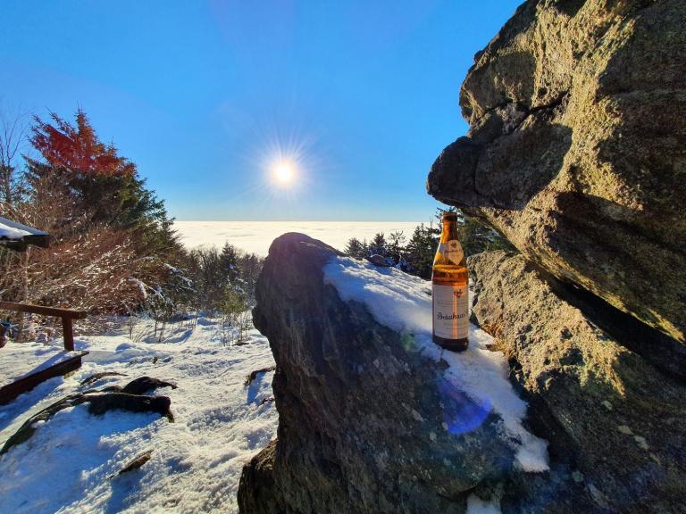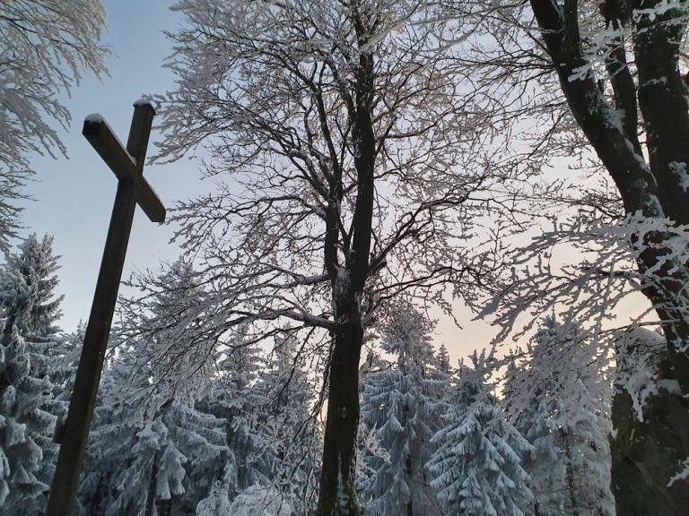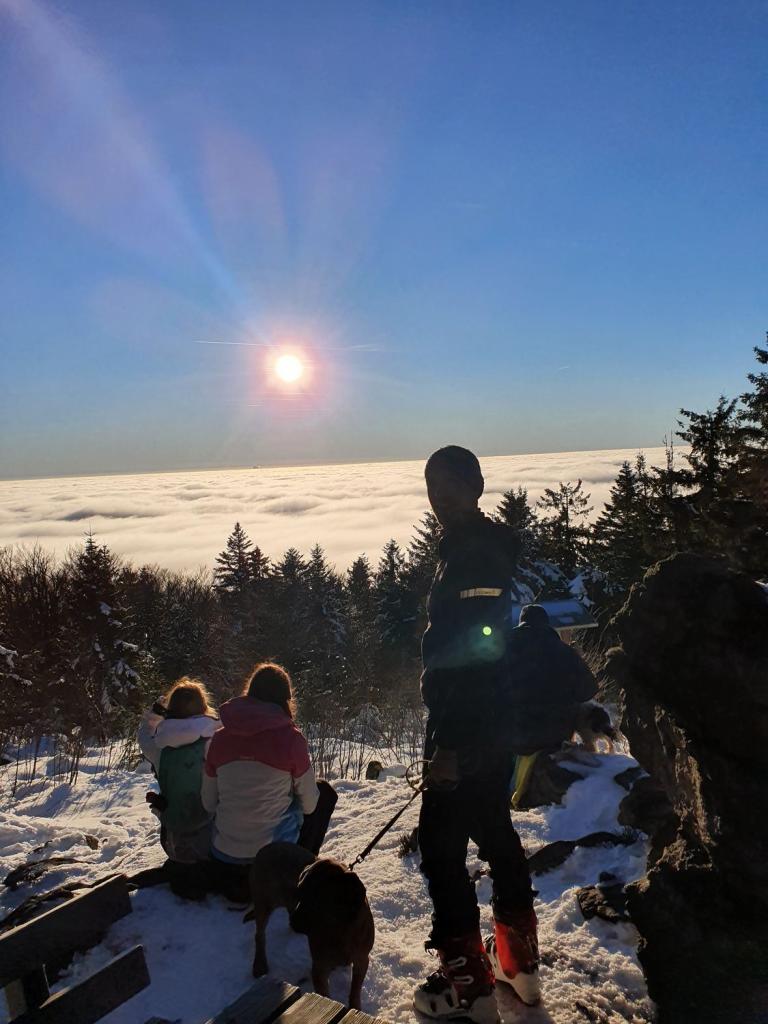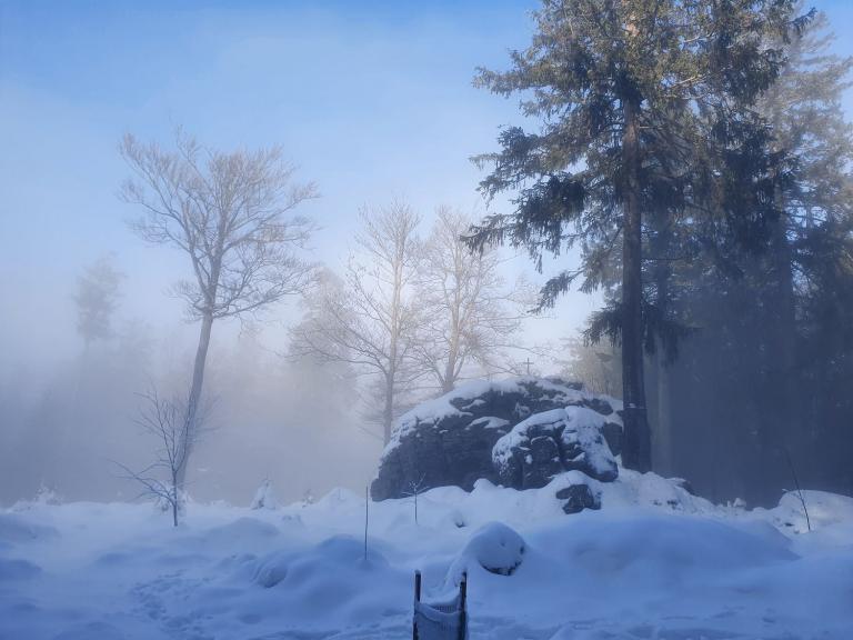 Wir bogen am Kletterwald nach links ab, querten die Langlaufloipe und kamen dann zur Kreuzung des Goldsteigwanderweges, der nach links zum Predigtstuhl (1024 m), geradeaus zum Hochberg (1025 m) und rechts zum Knogl (1056 m) führt. Unser erstes Ziel war der Hochberg, wo pünktlich die Sonne durch den Nebel blitzte. Die traumhafte Winterlandschaft zeigte sich von seiner mystischen Seite, dank dem Sonne- und Nebel Mix.