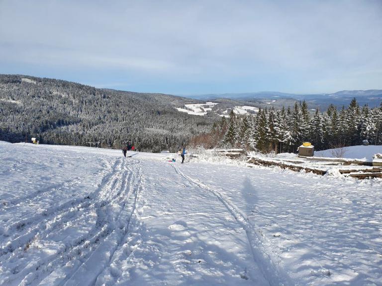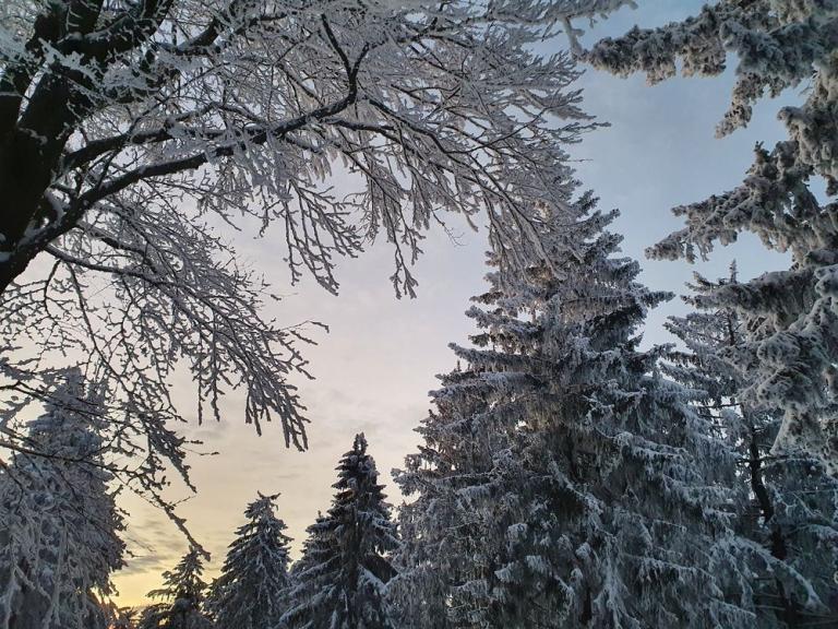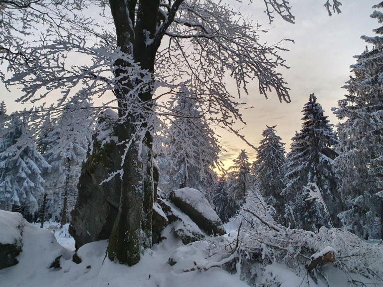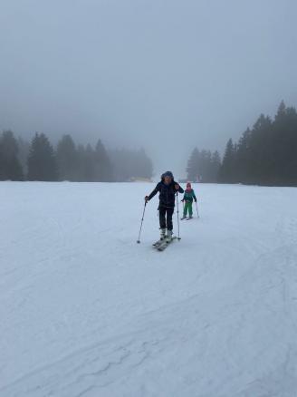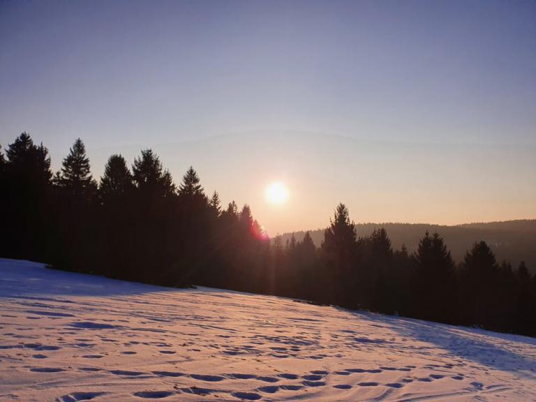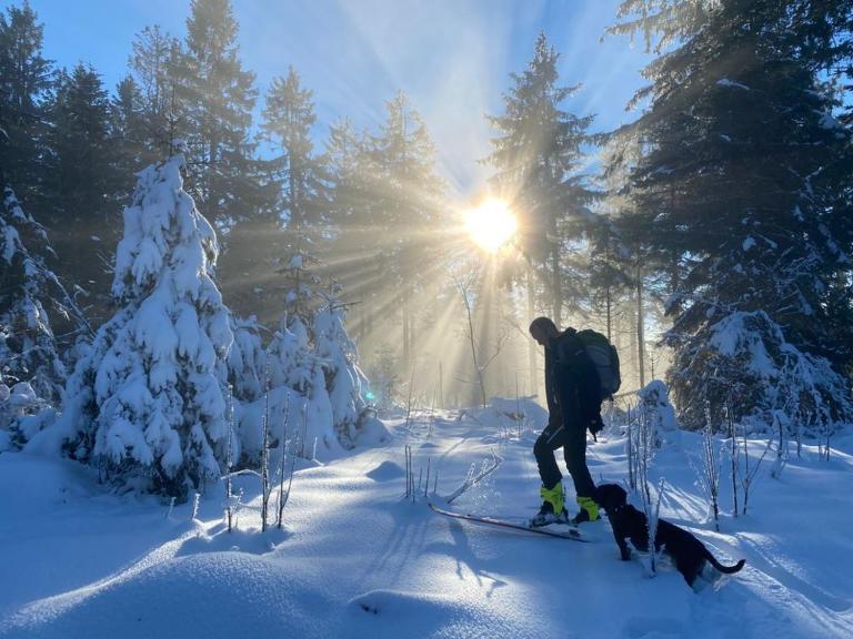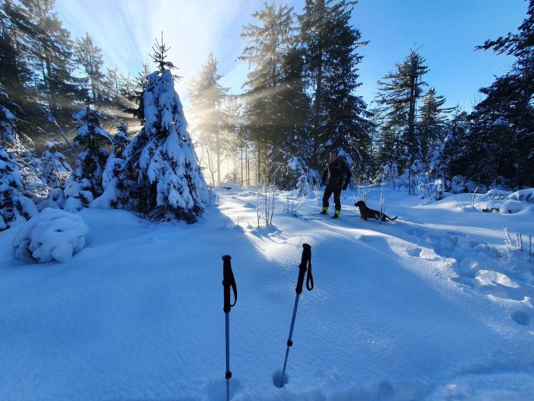 Tourbericht: Als es im Dezember schneite, waren Emma und ich krank. Dann ging der Schnee weg und an Skitouren war nicht mehr zu denken. Aber nun war der Schnee zurück und wir freuten uns schon auf die erste, gemeinsame Skitour. Emma und ich fuhren am späten Nachmittag nach Markbuchen bei Sankt Englmar. Es war kalt und neblig. Kein Mensch war zu sehen. Für den Skibetrieb reichte die Schneemenge noch nicht ganz aus. Wir aber marschierten mit unseren Tourenski los. Einsam kämpften Emma und ich uns nach oben. Der Nebel verzog sich langsam und der blaue Himmel kam zum Vorschein.