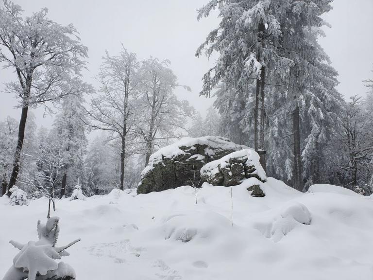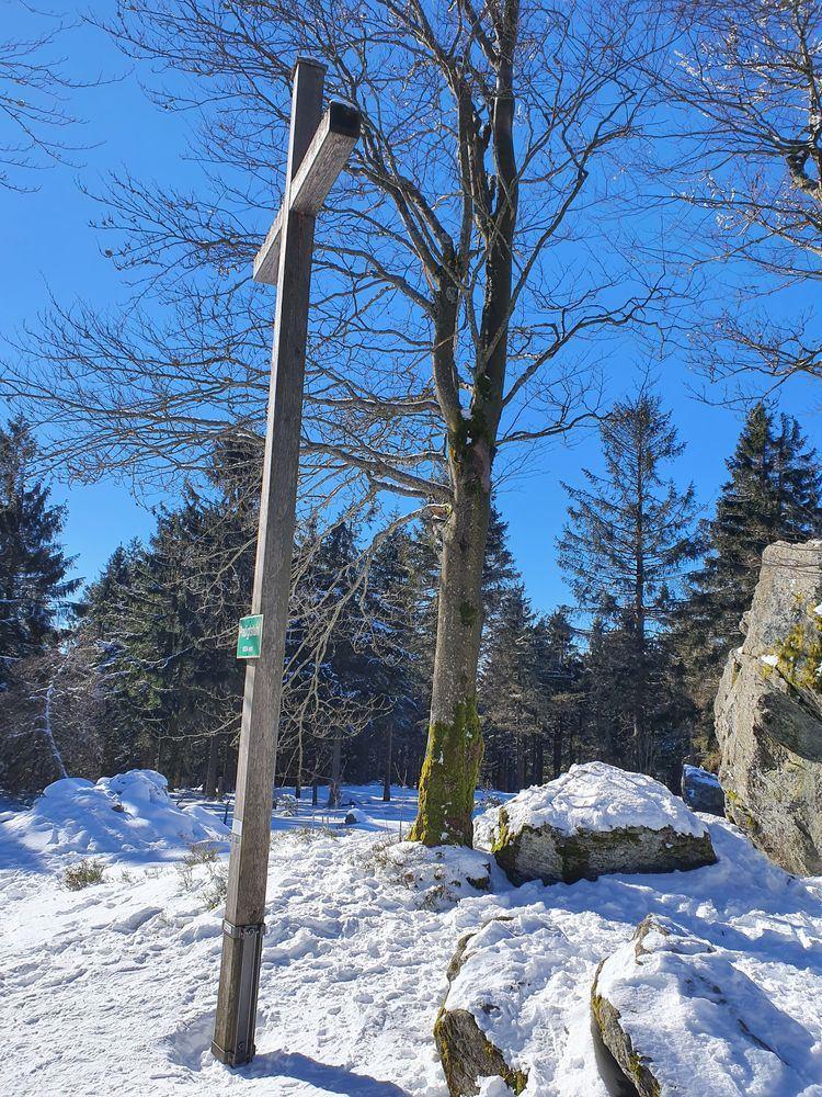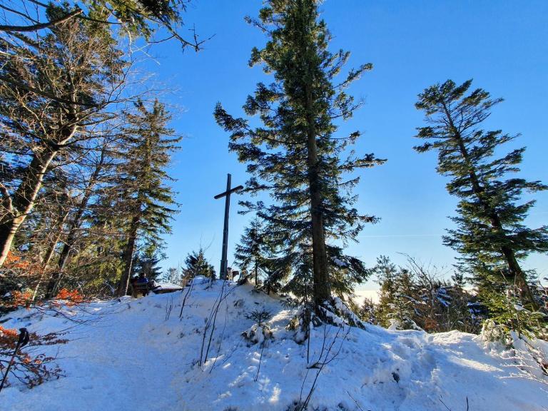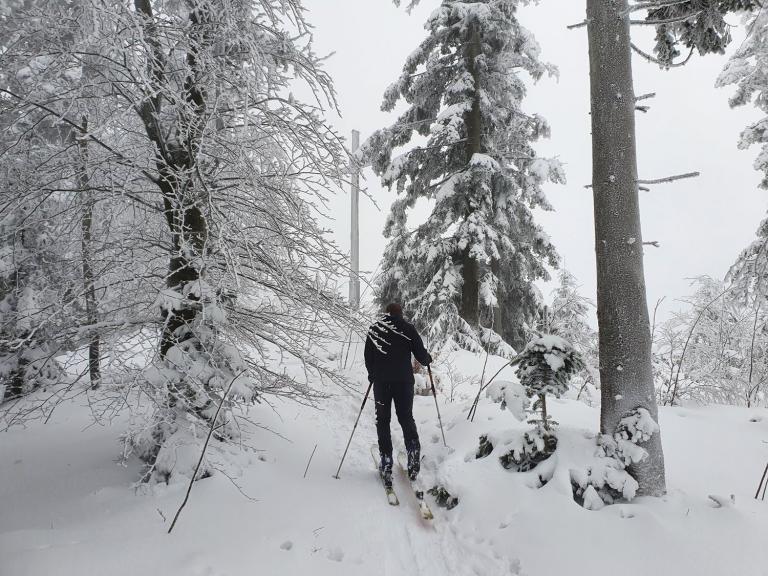Wir bogen am Kletterwald nach links ab, querten die Langlaufloipe und kamen dann zur Kreuzung des Goldsteigwanderweges, der nach links zum Predigtstuhl (1024 m), geradeaus zum Hochberg (1025 m) und rechts zum Knogl (1056 m) führt. Wir entschieden uns als erstes den Hochberg zu erklimmen und dann weiter zum Knogl aufzusteigen. Leider hatten wir keine Aussicht, aber das "Winterwonderland" konnte sich trotzdem sehen lassen. Auf gleichem Wege ging es dann zurück bis zum Predigtstuhlgipfel, von wo wir über die Piste abfuhren.