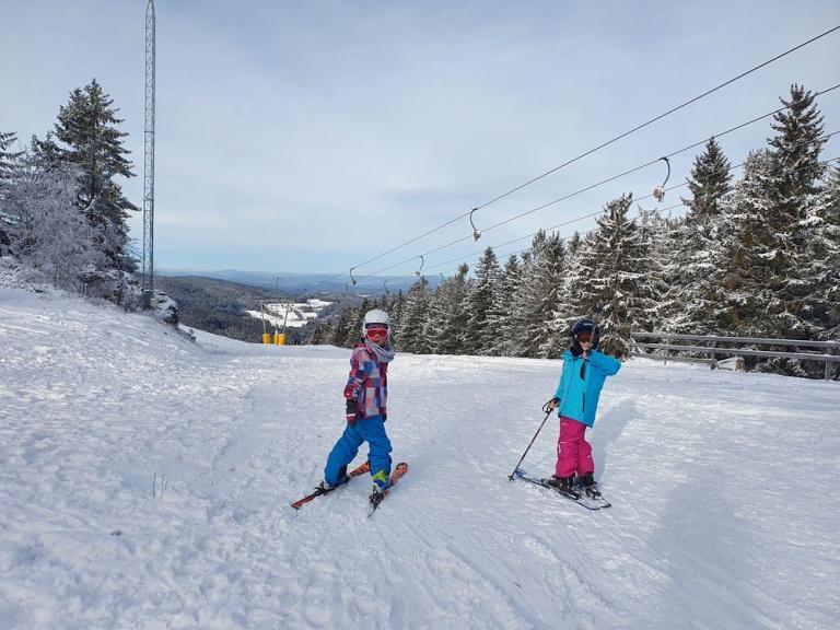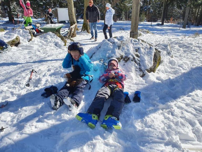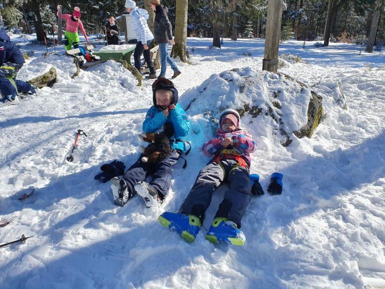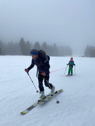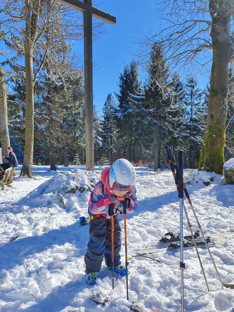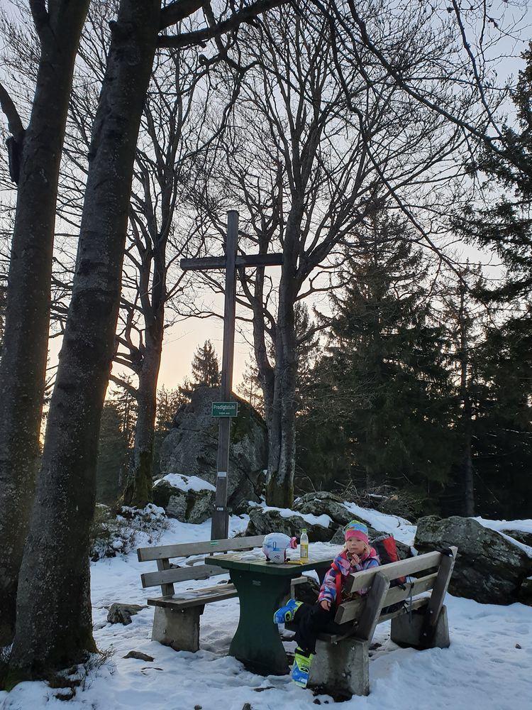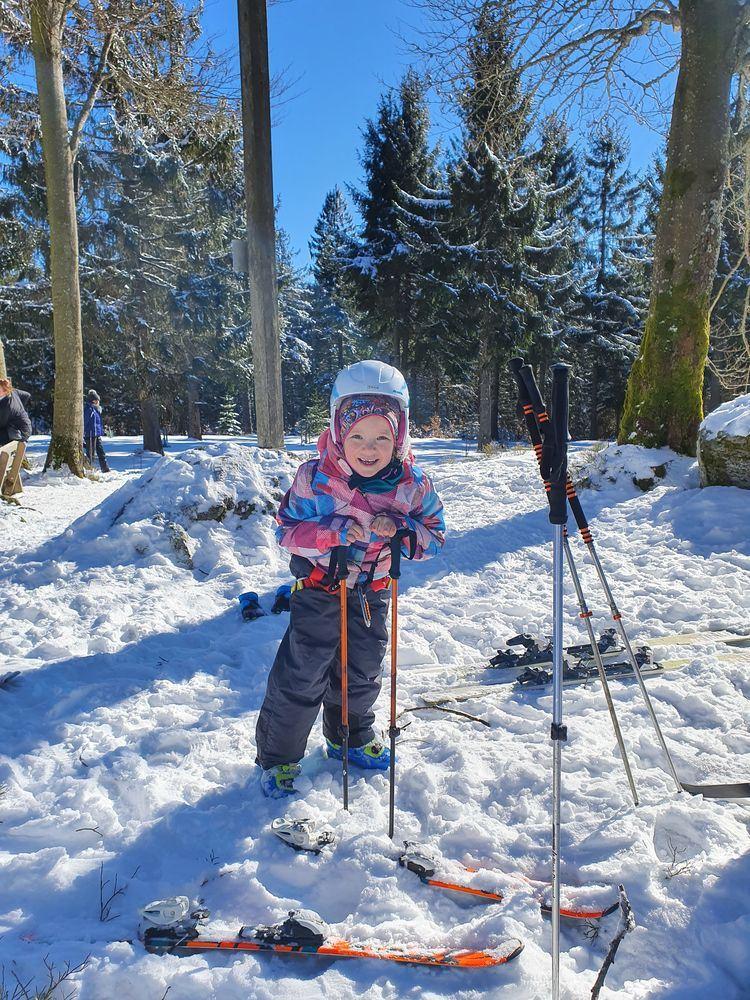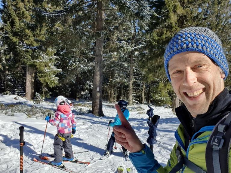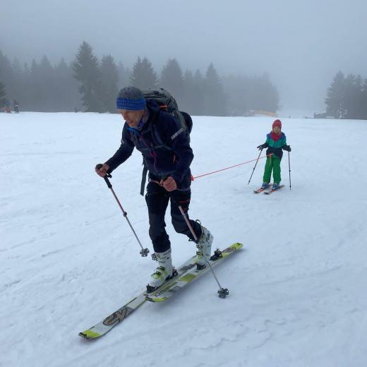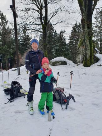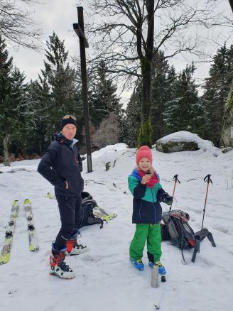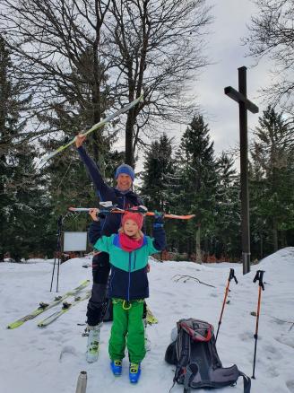 Tourbericht: Endlich hatte es wieder geschneit und das schöne Wetter wollten wir ausnutzen. Wir packten unsere Tourenskier ins Auto und fuhren nach Markbuchen. Bei traumhaftem Sonnenschein stiegen wir über die Piste auf. Emma ging mit ihren Tourenski selbst und Timi hing am Seil an mir dran. Somit zog ich den kleinen Kerl nach oben bis zum Predigtstuhlgipfel, wo es eine kleine Stärkung in Form von Kinderpunsch gab. Zusammen sausten wir die Piste bis zum Auto nach unten...