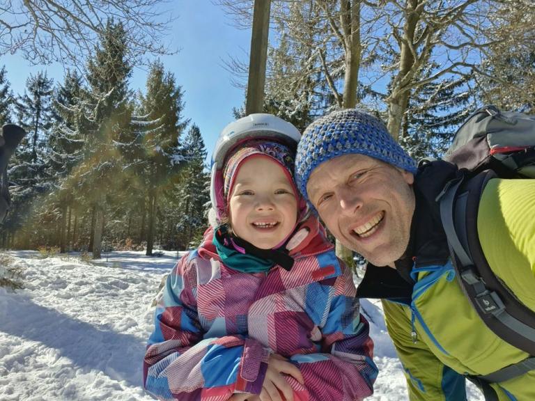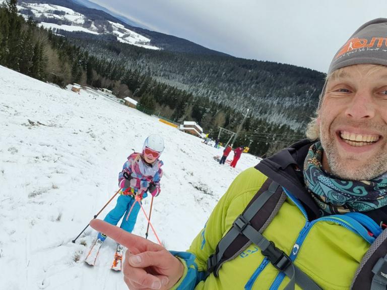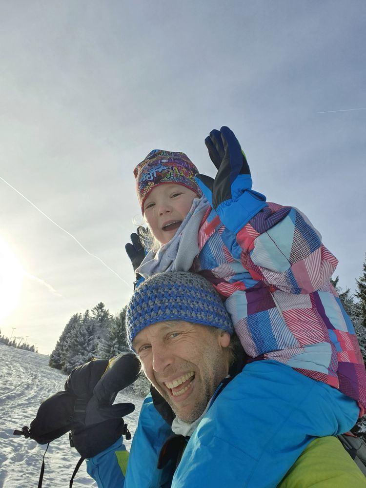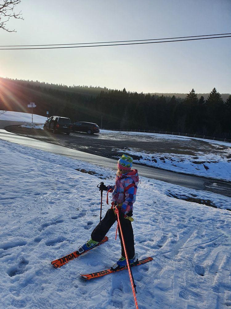 Tourbericht: Dank dem Coronavirus Lockdown waren alle Lifte gesperrt. Eine Alternative war schnell gefunden: Papa :-) Ich packte Emmas Ski an den Rucksack und Emma auf die Schulter und ab der Talstation des Predigtstuhllifts in Markbuchen konnte es los gehen. Zusammen mit meinem Kumpel Christoph der seine Tochter am Seil hinten nach zog, stiegen wir die Piste 170 Hm bis zum Predigtstuhlgipfel auf 1024 m nach oben. Zusammen fuhren wir dann mit den Ski ab. Natürlich machten wir das gleiche noch einmal :-)