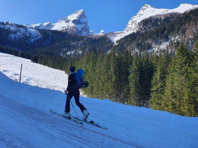 Brigitte und ich fuhren schon früh am Morgen nach Berchtesgaden zum Parkplatz Hammerstiel. Leider spielte der Verkehr nicht so ganz mit und wir kamen erst um 8 Uhr am Parkplatz bei herrlichstem Wetter an. Wir konnten noch einen der letzten Parkplätze ergattern. Da es am letzten Wochenende geschneit hatte, konnten wir direkt am Parkplatz mit den Ski starten. Zuerst wanderten wir den Forstweg nach oben, bis zur Schappbach Diensthütte. Gerade noch reichte die Schneedecke um bis zur Benzinkurve zu gelangen. Hier folgten wir dem Wegweiser "Watzmannkar". Zuerst auf einem schmalen Forstweg, dann ging es eine steile Schneise nach oben. Da der Schnee schon ziemlich durchfeuchtet war, blieb immer wieder der Schnee an den Fellen kleben. Dadurch hafteten die Felle nicht gut am Boden und wir rutschten immer wieder zurück und taten uns deshalb mit dem Aufstieg ziemlich schwer. Der war die steile Schneise nach oben ein ganz schöner Kraftakt, aber Brigitte schlug sich tapfer bis zum Watzmannkar. Hier wurde es kälter und die Felle hielten auch wieder. Vor uns sahen wir eine Schlange von Skitourengeher, die alle das 3. Watzmannkind besteigen wollten. Wir wanderten bis zum markanten Felsen, die Watzmannjungfrau, um dort nach links zu queren, um dann mit vielen Spitzkehren das Watzmannkind zu besteigen. Nach 4 Stunden 1450 Höhenmetern und 9 Kilometern stand wir Stolz auf dem Gipfel des 3. Watzmannkindes mit grandioser Aussicht in die Watzmann Ostwand und den Königsee. Hier fellten wir ab, fuhren ein Stück nach unten und suchten uns einen windstillen und sonnigen Platz im Schnee für eine Brotzeit mit Aussicht. Schöner ging es nicht, das Wetter und die Berge ein Traum. Nach unten fuhren wir dann ähnlich dem Aufstiegsweg. Die freien Hänge im Watzmannkar waren für uns gut zu befahren, aber die steile Schneise im Wald bis zur Benzinkurve war ein ziemlicher Kampf. Aber auch diesen Kampf gewannen wir und schafften es wieder zum Parkplatz zurück.