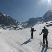 Charakter: Anspruchsvolle und dennoch beliebte Skitour durch ein steiles Tälchen und ein fantastisches Kar mit großartigen landschaftlichen Eindrücken. Geländepassage von stellenweise 40 Grad sind zu überwinden. Die Felsbarriere ziemlich am Anfang der Tour ist gut gesichert (sogar mit zwei Drahtseilen, eines weiter oben für höhere Schneelagen) und stellt für standfeste Skitourengeher normalerweise keine Schwierigkeit dar. Die zweite Stufe ist, wenn aper, ebenfalls ohne weiteres über ganz leichte Felsen zu überwinden. Bei guten Schneeverhältnissen wird man sogar mit Ski hinaufgehen. Unangenehm wird es hier nur bei Hartschnee und das gilt eigentlich für die gesamte Route. Denn vor allem in der unteren Hälfte folgt eine steile Passage nach der anderen. Die Tatsächliche Schwierigkeit der Tour ist also sehr stark von den Verhältnissen abhängig. Harscheisen unbedingt mitführen! Gute Sichtverhältnisse notwendig.