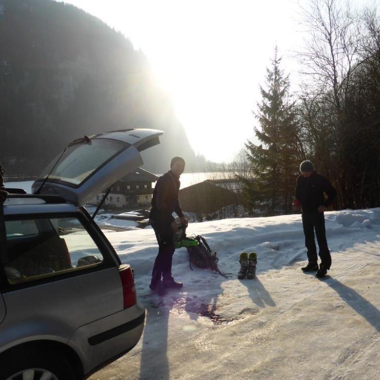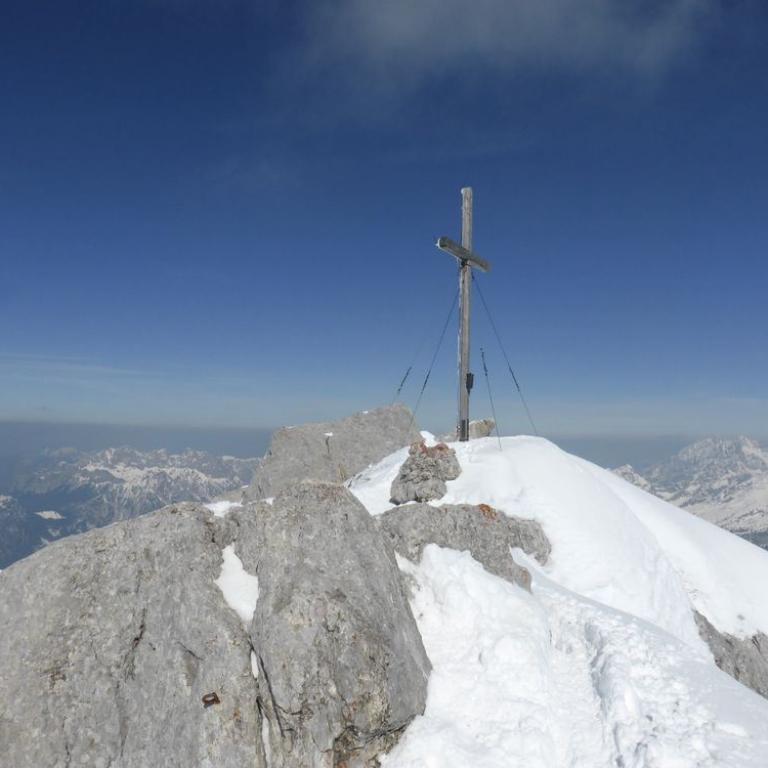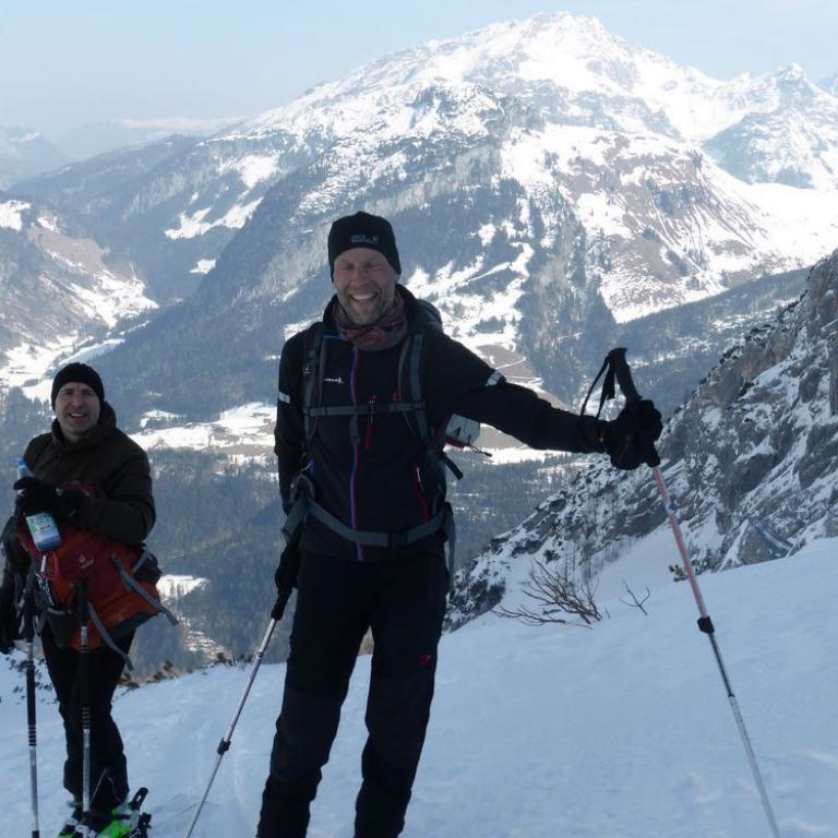 Das Wetter sollte traumhaft werden und es wurde traumhaft. Ideale Bedingungen für eine Skitour. Wolfi, Hans und ich starteten schon um 5 Uhr und waren auch schon um 8 Uhr am Ausgangspunkt in Weißbach (Frohnwies) bei Lofer. Wir konnten sofort mit den Ski starten, da der Schnee bis zum Parkplatz reichte. Nur 2 mal mussten wir kurz die Bretter tragen. Der Anstieg erfolgt entlang des Sommerwegs (Steig) zur Ebersberger Jagdhütte. Am Ausgangspunkt zeigt uns ein Wegweiser mit der Aufschrift "Abkürzung Ebersberg" den Einstieg in die richtige Route. Auf gut erkennbarem Weg durch den Wald kürzen wir eine weite Schleife der Forststraße ab, auf die wir nach ca. 100 hm wieder treffen. Wir folgen der Forststraße, bis ca. 150 m nach einer scharfen Linkskurve rechts der Steig zur Ebersberger Jagdhütte abzweigt. Wir kämpfen uns durch lichtes Gehölz nach oben und erreichen eine größere Lichtung unterhalb einer Felsstufe, die wir links umgehen. In ca. 1300 m Höhe kann man vom Wegverlauf nach links abweichen und über eine deutlich ausgeprägte Rinne nach oben steigen und die letzten großen Schleifen des Sommerweges abkürzen. In ca. 1425m liegt die Ebersberger Jagdhütte, die wir im Eifer des Aufstieggefechts nicht sahen :-) Der weitere Aufstieg vollzieht sich entlang von Rinnen, die durch lichten Lärchenwald und ohne weitere Orientierungsprobleme ins Ebersberger Kar führen, das wir auf dessen linker Seite betreten. Der gesamte Aufstieg durch das Kar erfolgt am besten auf der linken Seite. Wir folgten den vorhanden Spuren. Teilweise kämpften wir um Halt, da uns der Talski im leichten Schnee wegrutschte. Nach der zweiten Steilstufe drehen wir nach links ab und steigen über den sich aufsteilenden Schlußhang zum Kunchelnieder auf, dem Verbindungsgrat zwischen Birnhorn und Kuchelhorn (Wegweiser am Grat erkennbar). Mittlerweile kamen wir aus dem schattigem Kar in die Sonne und konnten immer mehr die herrliche Aussicht genießen. Am Fuße des Birnhorns richteten wir ein Skidepot ein. Der Gipfel sah ziemlich spektakulär aus. Der Aufstieg zum Birnhorn führt entlang von Felsbändern und über Steilstufen auf einem teilweise versicherten Steig. Das Stahlseil lag teilweise unter dem Schnee, so das wir einige Meter ohne Seilhilfe queren mussten. Den Blick in die Tiefe ersparte ich mir und kletterte teilweise auf allen Vieren im Schnee nach oben. Mit den Skischuhen war es ganz schön anstrengend, aber der traumhafte Blick vom Gipfel belohnte uns. Ein eisiger Wind wehte am Gipfelkreuz, aber für ein Gipfelfoto war natürlich Zeit. Auf dem gleichem Weg kraxelten wir wieder zurück zum Skidepot, wo wir eine kurze Rast einlegten. Meist auf der Aufstiegsspur fuhren wir dann ab. Irgendwie tat ich mich heute richtig schwer, obwohl wir optimale Schneeverhältnisse im oberen Bereich hatten. Ich kämpfte mich regelrecht nach unten. Immer wieder wurde ich durch Stürze gebremst. Im Wald wurde es für mich dann, dank meinem Skifahrerischem Können, so richtig schwer. Die Kraft ließ immer mehr nach und irgendwann hatte ich die Schnauze voll und trug die Ski die letzten 300 Hm Richtung Tal.