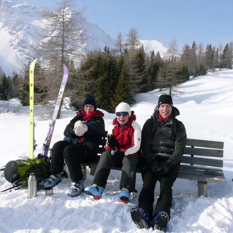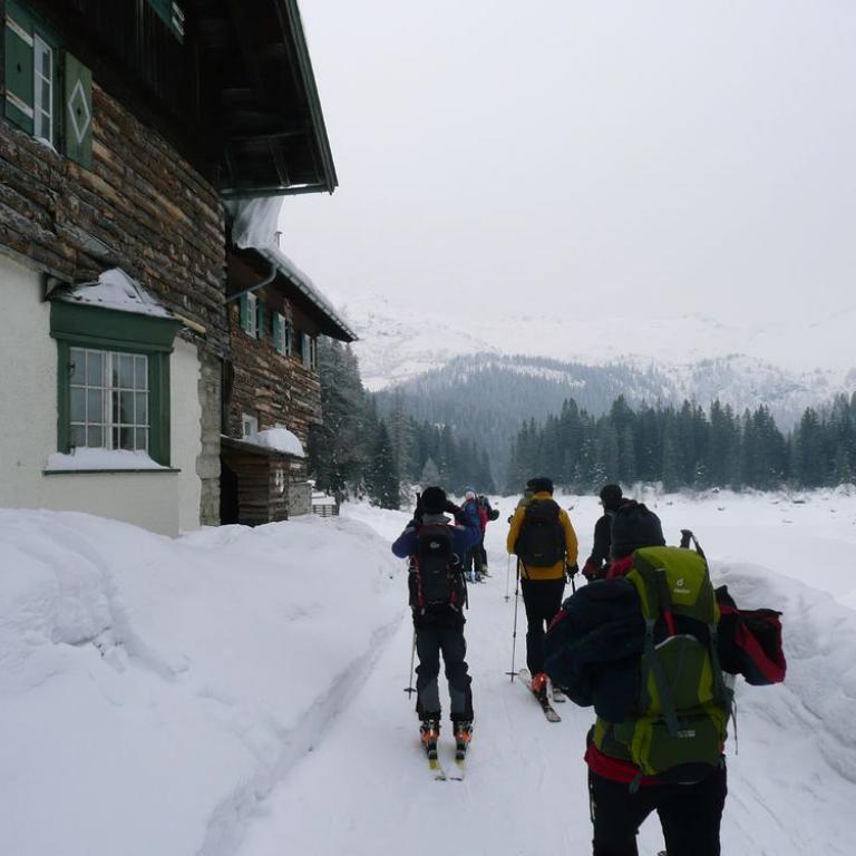 Im Zuge des Skitourenkurses stand die Besteigung des Grubenkopfes für diesen Tag auf dem Plan. Gleich vorweggenommen, wir erreichten leider nicht den Gipfel des Grubenkopfes dank des wenigen Schnees im Gipfelbereich, aber bis zum Grubenjoch konnten wir problemlos gehen. Nach dem Frühstück im Almis Berghotel packten wir unsere Ski und Ausrüstung ins Auto, um zum Parkplatz am Ende des Obernbergtals zu fahren. Unser Auto sprang dank der eisigen Kälte von minus 25 Grad erst nach mehreren Versuchen an. Am Parkplatz angekommen durft Sepp als erster gleich die Führung übernehmen. Zuerst führte uns die Tour über Forstwege und Almwiesen empor bis zur Oberreinsalm und vorbei am zugefrorenem Obernberger See. Bergauf in Bewegung konnte man die Kälte ganz gut ertragen, aber als wir auf einer Lichtung die Verschüttetensuche mit LVS Gerät, Sonde und Schaufel übten, froren wir ganz schön ein. Auf einer Höhe von etwa 1800m führt die Aufstiegspur zwischen zwei Hütten durch und danach kurz bergab. Weiter ging es über einen Bachlauf und einen kurzen Steilaufschwung aufwärts. Hier hatten wir herrlichen Sonnenschein und blauen Himmel. Peppi erklärte uns wie man sich in diesem Gelände verhält, welche Gefahrenbereiche auftreten und auch die Führung übernahm immer wieder ein anderer Kursteilnehmer. Flacher weiter gingen wir gegen Süden, eine sperrende Geländekuppe links umgehend, in die weite Mulde direkt unterhalb des gewaltigen Nordhanges vom Grubenkopf. Etwas steiler aufwärts in die Einsattelung zwischen Geierskragen und Grubenkopf bewegten wir uns bis zum Grubenjoch auf ca. 2200 Meter. Hier wehte uns ein eisiger Nordwind entgegen. Schnell legten wir unsere Felle zusammen, da wir auf Fels standen und uns der Weg Richtung Gipfel ohne Schnee versperrt war und auch die Temperaturen waren nicht gerade angenehm. Schon standen wir auf den Skiern und abwärts ging es zuerst teilweise über herausstehende Felsen bis wir über herrlichen Schnee abfahren konnten. Auf halber Strecke machten wir Pause in der Sonne, was Peppi auch gleich nutzte, uns das Schneeprofil näher zu erklären. Wir gruben uns bis zum Erdboden durch den Schnee und konnten so die einzelnen Schneeschichten bewundern. Als wir wieder die Waldgrenze erreichten, konnten wir einen Steinadler beobachten. Spätnachmittags erreichten wir wieder unsere Autos. Bei noch immer fast 20 Minusgraden sprangen aber diesmal alle Gefährte problemlos weg.