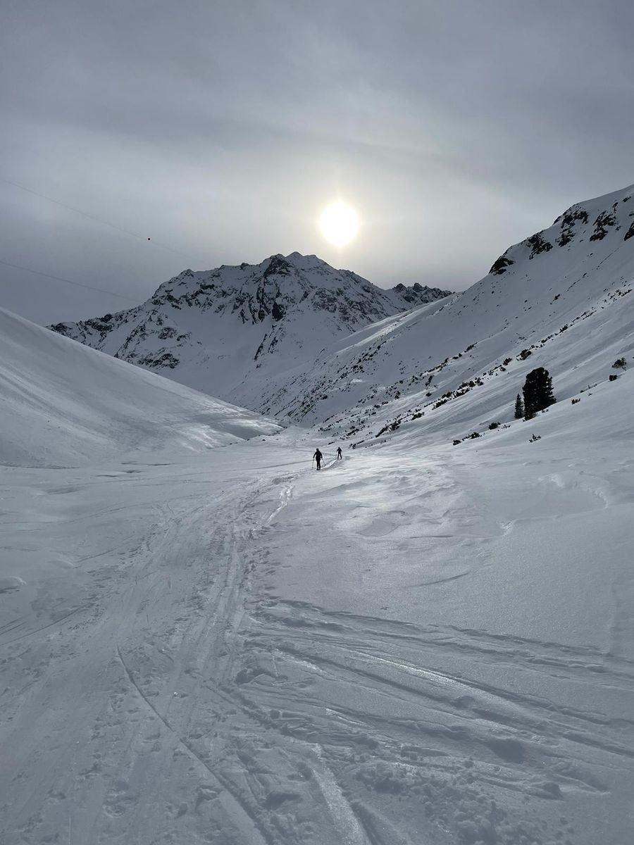 Die Skitouren um Innsbruck haben fast schon Tradition. Nicht zum ersten Mal waren Hans und ich als Tourenteilnehmer gemeldet. Insgesamt wollten 12 Alpenvereins Mitglieder inklusive Tourleiter Tom die Stubaier Alpen mit den Tourenski unsicher machen. Die Schneeverhältnisse sollten trotz notorischen Schneemangels in den Alpen weitgehend passend, da die geplanten Startpunkte der beiden Touren über 1500 m liegen. Der Alpenverein Straubing ist seit kurzem stolzer VW-Bus Besitzer, damit die Anreise in die Berge etwas umweltverträglicher und nachhaltiger gestaltet werden kann. Somit trafen wir uns am Pendlerparkplatz Aiterhofen, um mit zwei Fahrzeugen die Reise in die Stubaier Alpen anzutreten. Eine Stärkung gab es noch beim Bäcker Ruetz in Innsbruck, bevor wir den kostenpflichtigen Wanderparkplatz in Praxmar auf 1700 m erreichten. Schnell standen wir auf den Ski und unsere LVS Geräte konnten wir an der eigens dafür vorgesehenen Teststation auf Funktion überprüfen. Wir bogen nach rechts ab, um durch einen Zirbenwald aufzusteigen. Immer wieder überquerten wir eine Rodelpiste. Die Sonne begleitete uns und die Aussicht auf die schneebedeckten Gipfel war traumhaft. Auf 2100 m zweigt die Route zur Lampsenspitze ab, wir folgten aber dem Wegweiser „Grieskogel“. Rechterhand befindet sich ein großes Almkreuz. Die Hänge werden steiler bis wir in den Kessel „Praxmarer Kühgrübl“ gelangten. Leider wurde hier die Sicht erheblich schlechter und wir sahen nur schwer die Aufstiegsspur. Vor uns lag ein steiler Südhang, der nur mit vielen anstrengenden Spitzkehren zu bezwingen war. Wir hatten kaum noch Sicht und die meisten entschieden sich fürs Umkehren. Zu fünft erreichten wir eine flache Rampe, über die wir den Vorgipfel erreichten. Die letzten Meter zum leicht ausgesetzten Gipfel legten wir ohne Ski zurück. Leider gibt es kein Gipfelkreuz, aber pünktlich zum Gipfelsieg gaben die nebeligen Wolken die Aussicht auf die umliegenden Gipfel, wie Zischgeles und Lampsenspitze frei. Auf gleichem Weg, wie Aufstieg, fuhren wir ab und zum Schluss sausten wir über die Rodelpiste nach unten. Unser Hotel Bon Alpina in Igls, etwas oberhalb Innsbrucks, war perfekt zum Ausklingen des tollen Tages. Ich joggte noch ein paar Kilometer über die Hochebene von Igls und der Rest genoss Sauna und Pool, bevor wir zum Abendessen gingen.