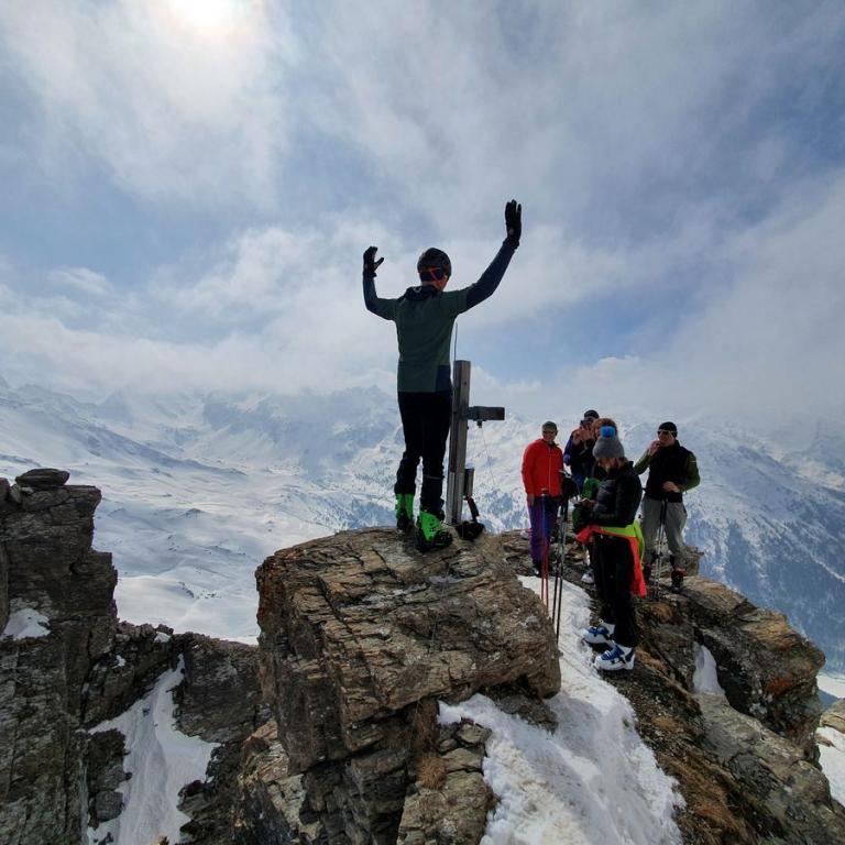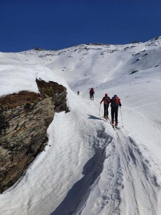 Auch am Sonntag war das Wetter perfekt für neue Taten. Unser Ziel war der 3004 m hohe Zischgeles in den Stubaier Alpen. Am kostenpflichtigen Parkplatz in Praxmar konnten wir mit den Tourenskier starten. Über eine ehemalige Skipiste stiegen wir bei schönstem Sonnenschein nach oben. Über flaches Gelände gelangten wir in einen freien Talkessel. Wir hielten uns mittig, da rechts von den steilen Hängen schon ein paar Lawinen abgegangen waren. Weiter oben blieb der Schnee von den Sonnenstrahlen verschont, so dass keine Lawinengefahr bestand. Am Ende des Talkessels machten wir Rast und entschieden uns für Harscheisen, da der Schnee ziemlich gefroren war. Über einen Steilhang stiegen wir in Serpentinen bis zum Rücken nach oben. Hier querten wir nach rechts bis zum Gipfelaufbau des Zischgeles. Hier machten wir ein Skidepot und kraxelten über den teilweise ausgesetzten und vereisten Gipfelgrat auf den Dreitausender. Wie schon gestern auf der Eiskarspitze hatten wir auch heute eine tolle Aussicht auf die schneebedeckten Gipfel. Auf dem Aufstiegsweg stiegen wir zum Skidepot ab und fuhren dann nach unten. Der Schnee war alles andere als perfekt, vereist, harschig, sulzig, alles war dabei. Trotz dem ein oder anderen Sturz gelangten wir alle unversehrt zurück zum Parkplatz. Eine kurze Einkehr in Praxmar gehörte als Abschluss eines traumhaften Skitourenwochenendes dazu.