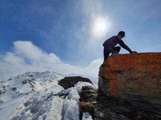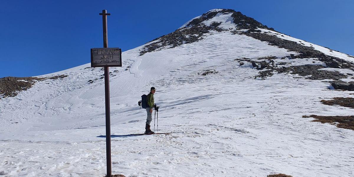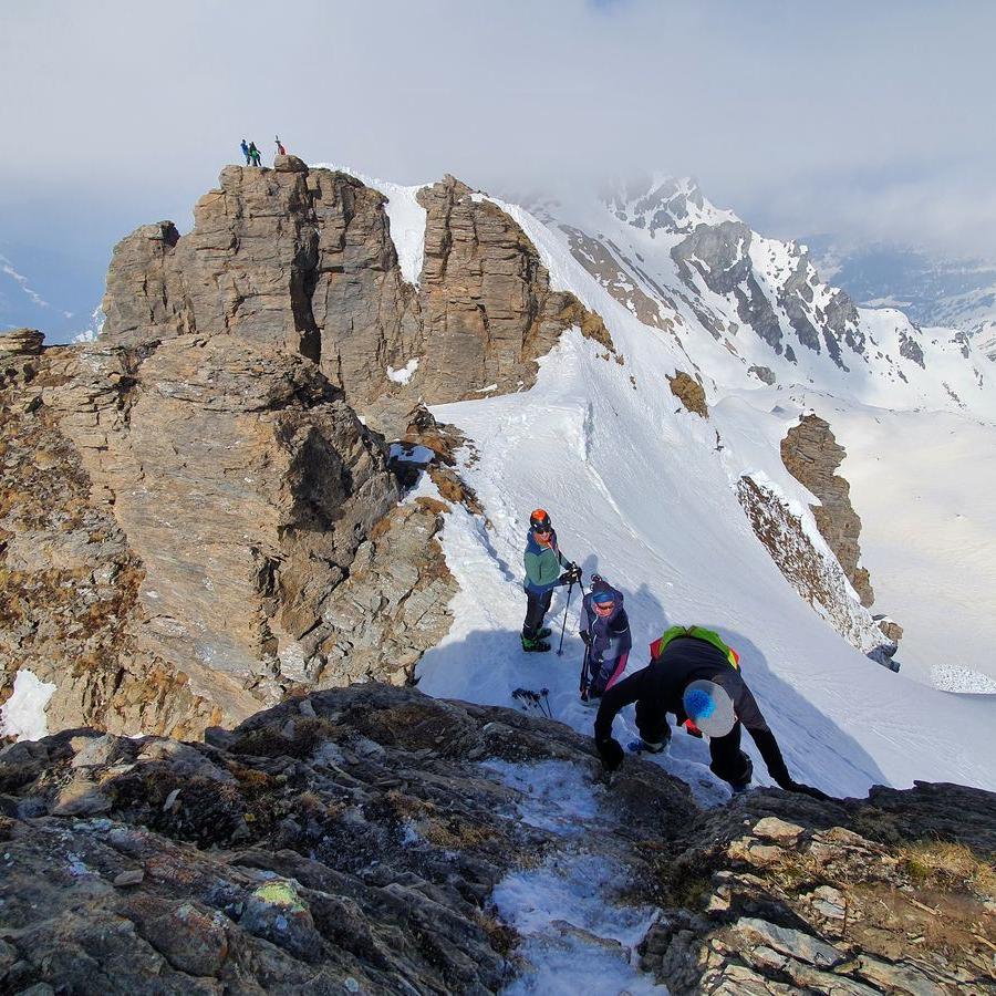 Von hier sieht der Aufstieg zur Eiskarspitze spektakulär aus. Mit den Skier kann man noch ein Stück über den Rücken marschieren, bis es steiler wird. Hier sollte man ein Skidepot errichten und zu Fuß weitergehen. Es geht über Steilstufen auf den Vorgipfel und über den teilweise ausgesetzten Grat in Richtung Hauptgipfel. An der Nordseite klettert man ein paar Meter ab, wo kurz darauf ein Schneegrat überwunden werden muss.
