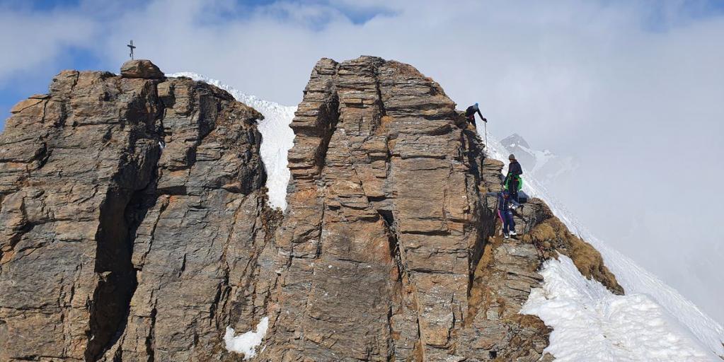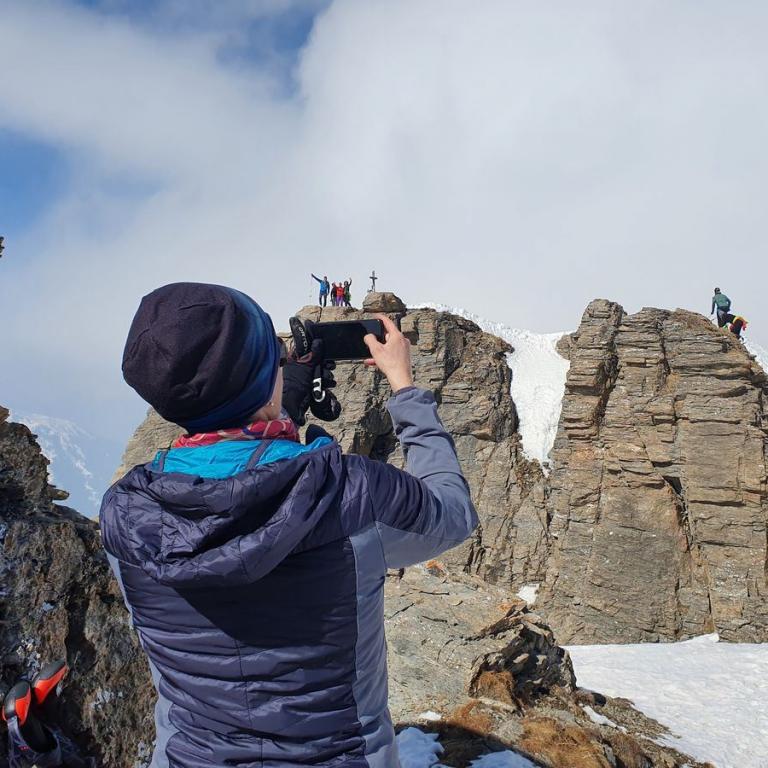 Zum Schluss klettert man eine Kante nach oben. Auf den letzten Metern zum kleinen Gipfelkreuz ist nochmals Konzentration gefragt, da es rechts wie auch links steil nach unten geht. Die Aussicht auf die Tuxer Alpen ist grandios und atemberaubend.