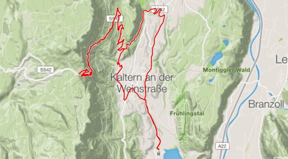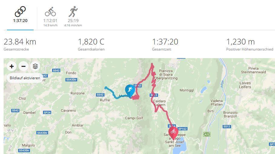 Ich checkte in dem gemütlichen Hotel ein und packte meine Taschen aus und verstaute alles im Zimmer, wo schon Emma`s Bettchen aufgebaut war. Ich startete dann auch schon zur ersten Radausfahrt. Ich drückte schnell den Mendelpass auf 1363 m hoch. Nach 1 Stunde und 15 Minuten hatte ich auch schon die 1200 Höhenmeter weggeballert. Ich hatte eine herrliche Aussicht und in der Sonne war es angenehm, aber beim bergabfahren froren mir regelrecht die Zehen und Finger ein. Im Anschluss lief ich noch eine 8 Kilometer Seerunde im 4:30 er Schnitt. Am Abend ging ich mit meinen Laufstilanalyse.de Kollegen zum Essen in eine naheliegende Pizzeria.