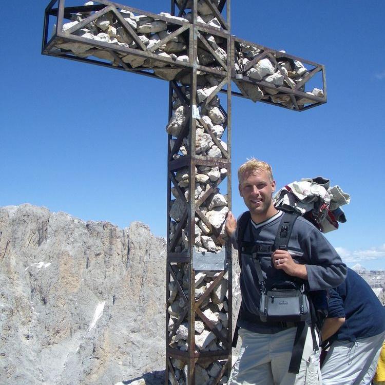 Die Aussicht auf dem Gipfel ist grandios, da keinerlei Wolken die Sicht behinderten. Wir konnten das gesamte Grödnertal, Seiseralm, Marmolada und die umliegenden Dolomitenberge bewundern. Wir machten Brotzeit und fütterten ein paar Dohlen gleich mit.