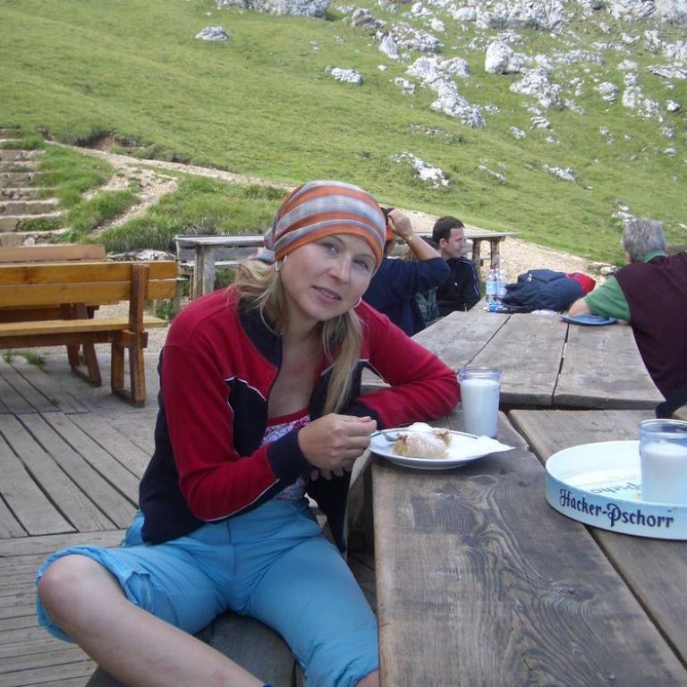 Wir überqueren die Scharte und steigen ab zur Tierser Alpl Hütte (2440 Meter). Hier machten wir Rast und es gab eine frische Milch.