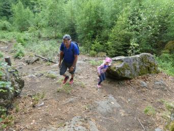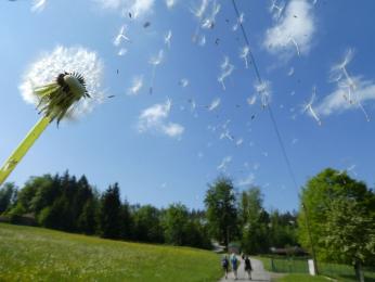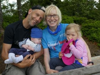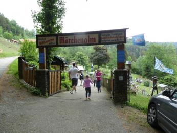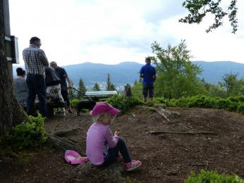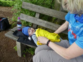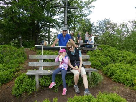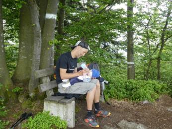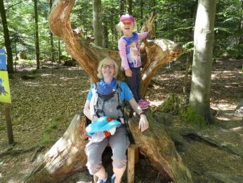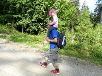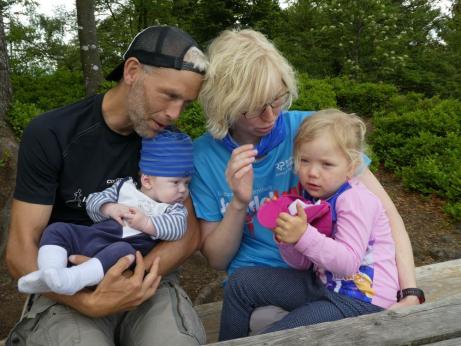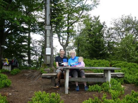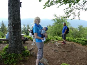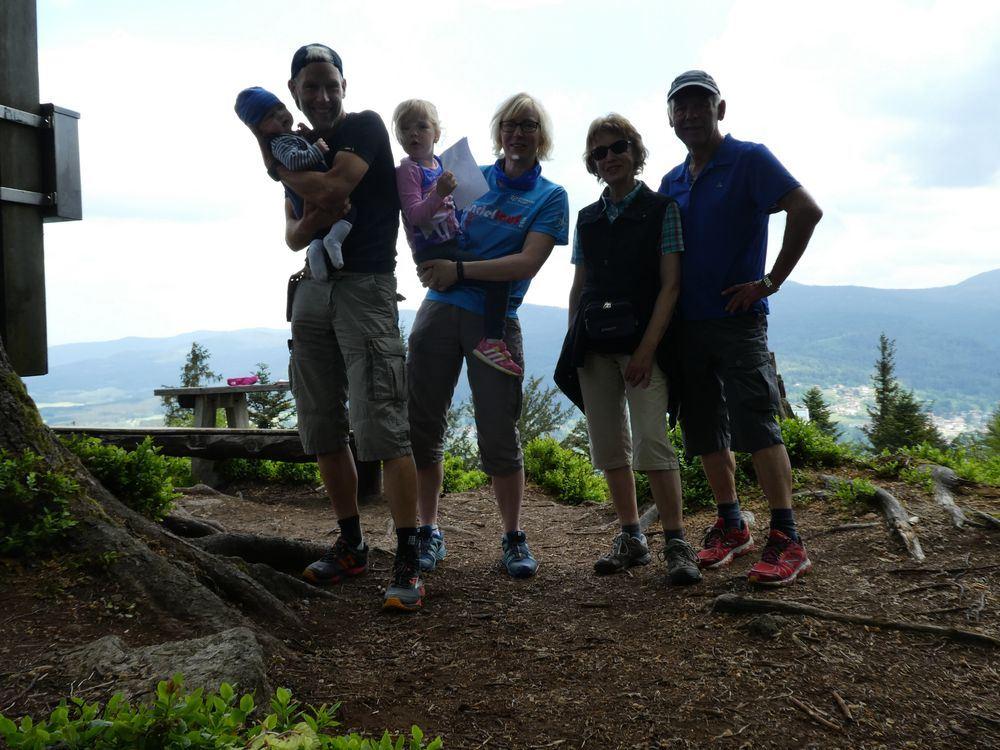 Mit Opa und Omi fuhren wir nach Bodenmais um zur Harlachberger Spitze zu wandern. Am Wanderparkplatz bei Bodenmais am Ameisenweg startete unsere Wanderung bei Sonne und blauem Himmel. Zuerst wanderten wir in Richtung Glashütte auf einer Forststraße. Emma ging fleißig selbst. Ein paar Meter musste Opa unseren großen Zwerg tragen :-) Der kleine Zwerg war in der Trage bei Brigitte. Über einen Steig erreichten wir nach ca. 1 Stunde und 15 Minuten die Harlachberger Spitze samt Gipfelkreuz. Wir hatten eine herrliche Aussicht auf Arber und Co. Am Gipfel machten die Kleinen Brotzeit. Es gab Milch für Timi und Streichwurstbrot für Emma. Unser nächstes Ziel war die Märchenalm bzw. Obersteinhaus. Hier gab es einen riesigen Spielplatz und eine gemütliche Almwirtschaft, wo wir zuerst etwas aßen. Es fing etwas zu regnen an und gleichzeitig schien die Sonne. Wir sausten dann auf dem Spielplatz umher. Langsam wurde Emma müde und wir machten uns auf den Rückweg. Ich lief auf Trails zurück zum Parkplatz und holte das Auto um auf der Forststraße bis zum obersten Wanderparkplatz zu fahren. Hier lud ich dann die Zwerge und Brigitte ein. Opa und Omi wanderten noch weiter, während wir nach Hause fuhren...